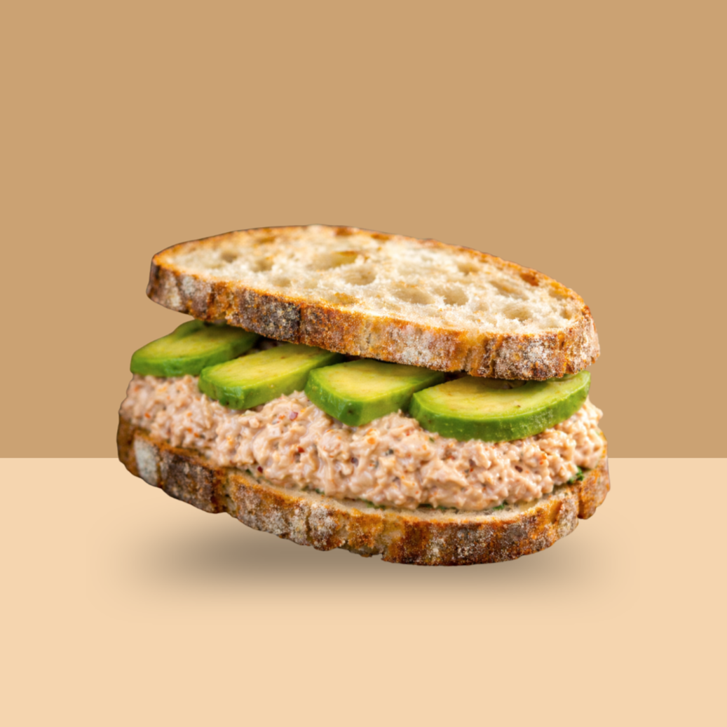 Ensalada de atún cremosa con chipotle de la casa, aguacate fresco y pesto en pan de masa madre.