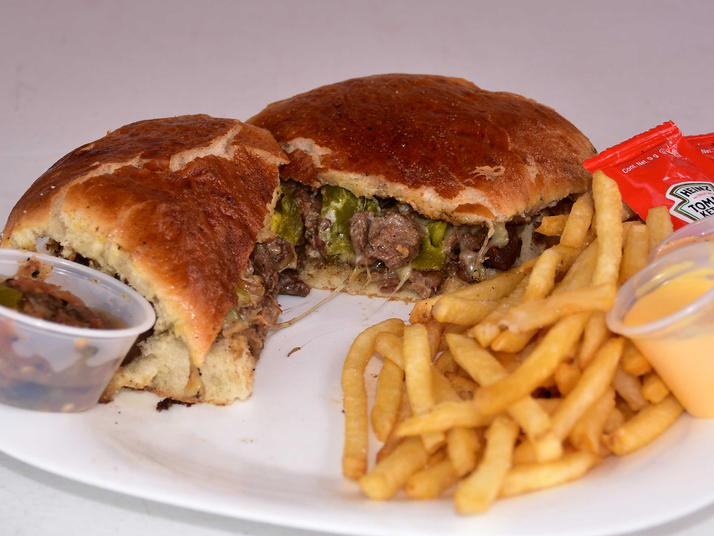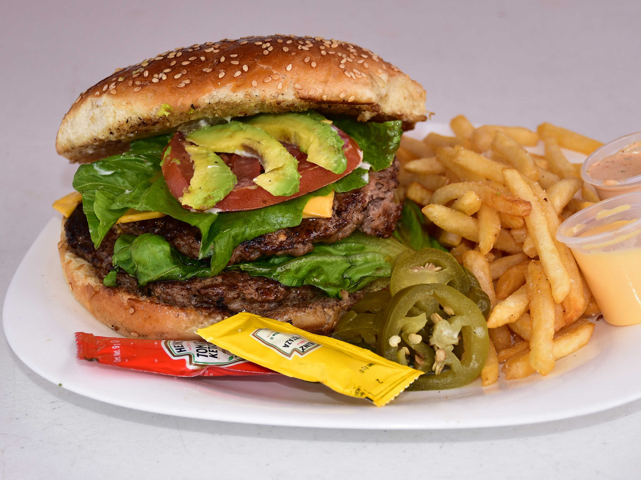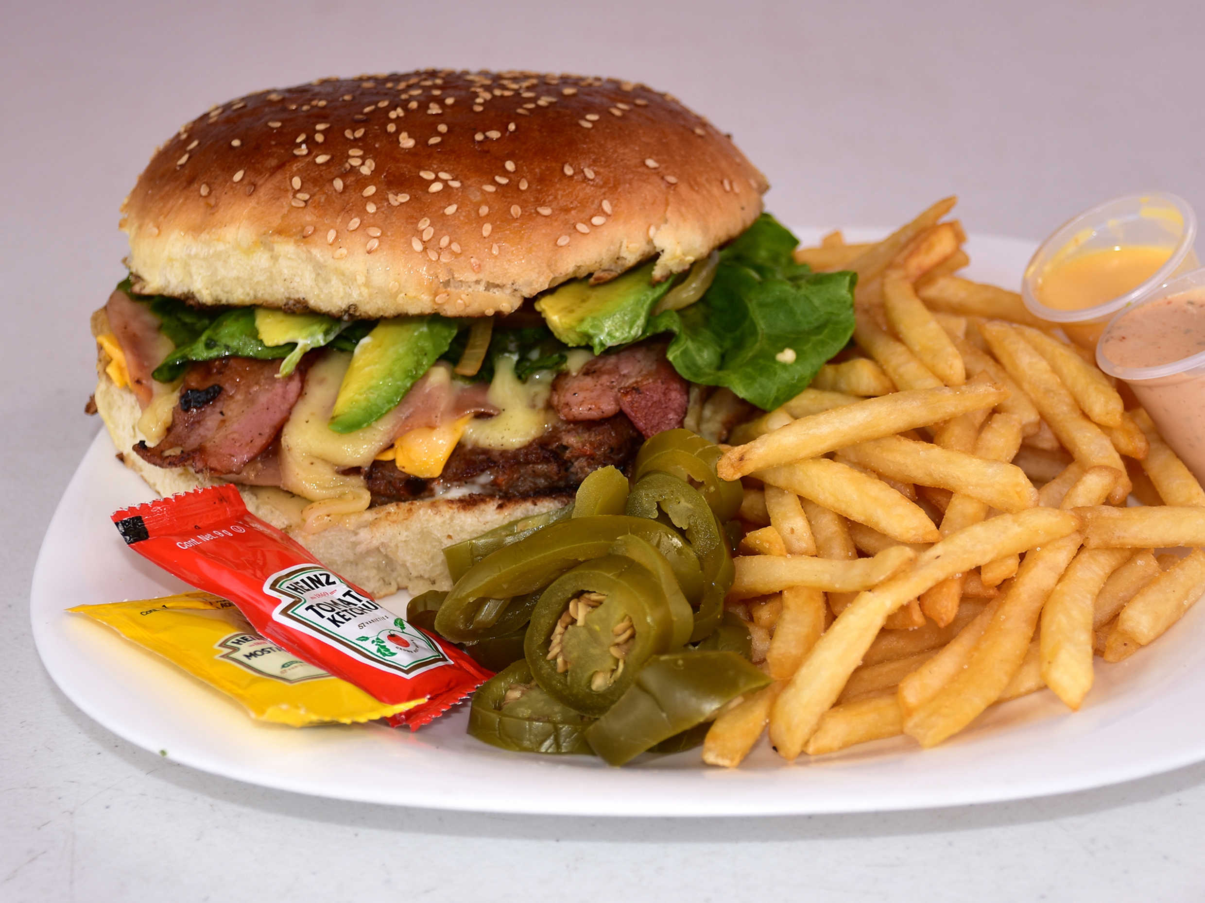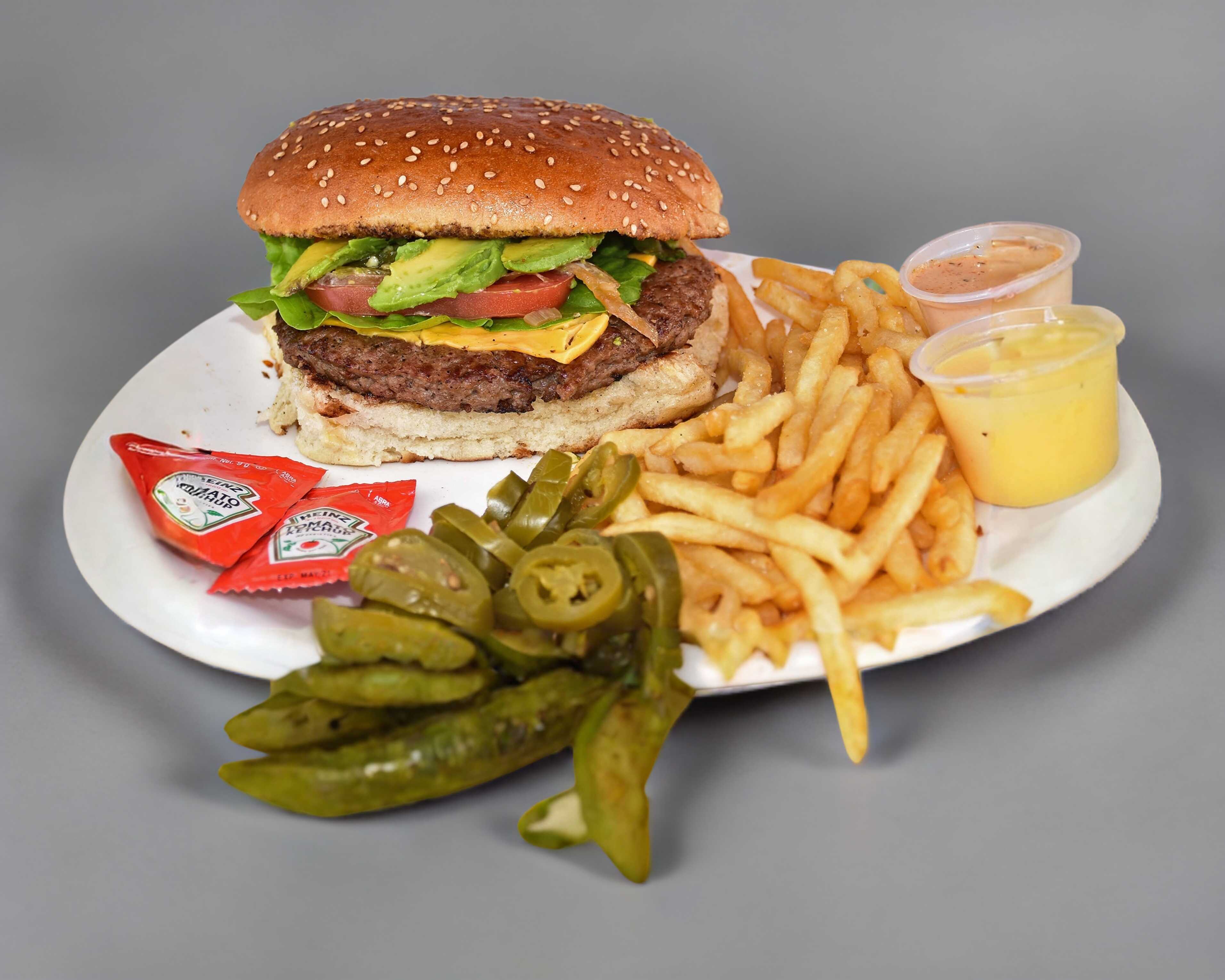 Carne (75% res y 25% tocino) queso tipo americano, cebollita a la plancha, chile verde tatemado, aguacate, tomate, lechuga, mayonesa, mantequilla y papas.