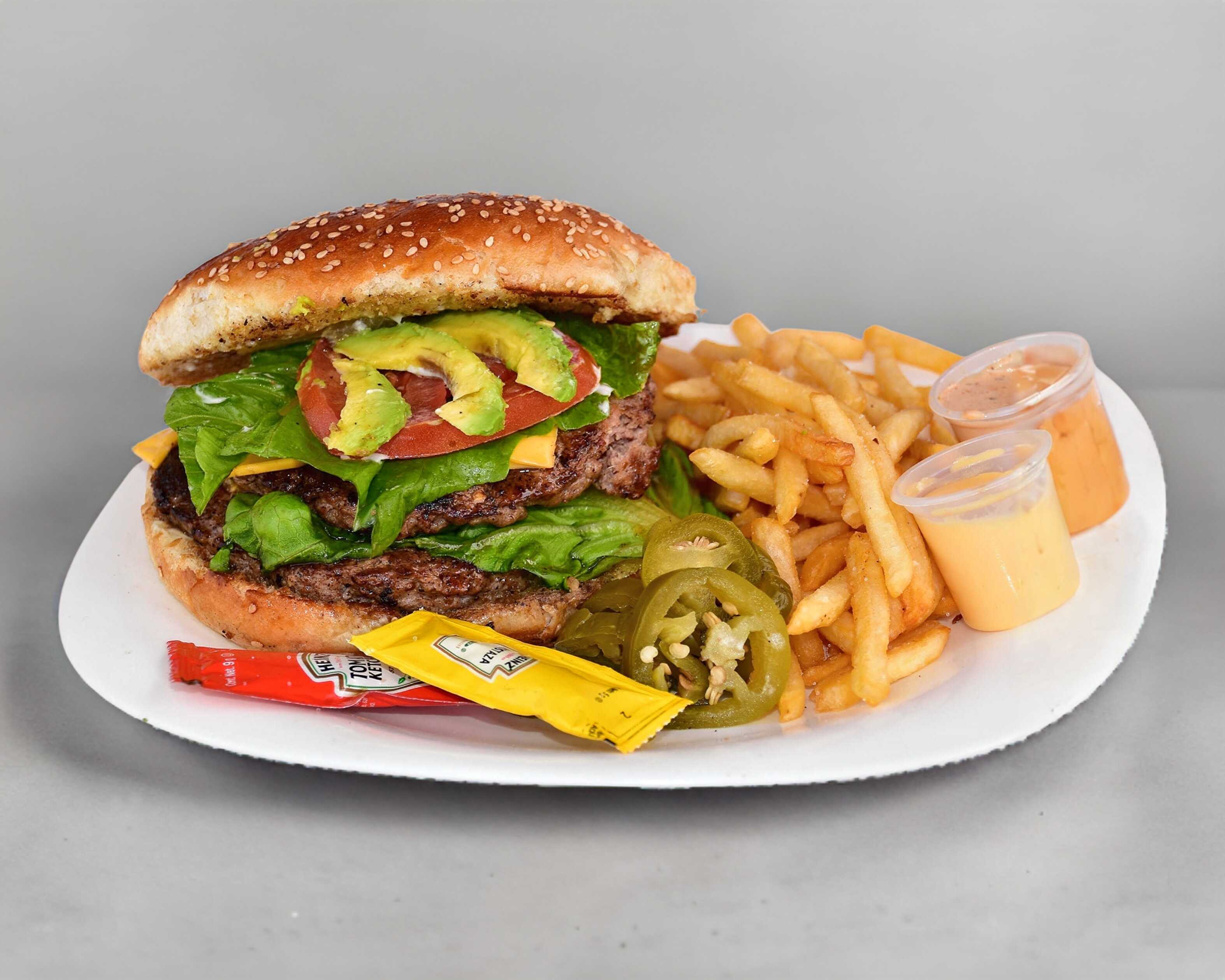 Doble Carne (75% res y 25% tocino), doble queso tipo americano, doble cebollita caramelizada, doble chile verde tatemado, doble aguacate, doble tomate, doble lechuga, mayonesa, mantequilla y PAPAS