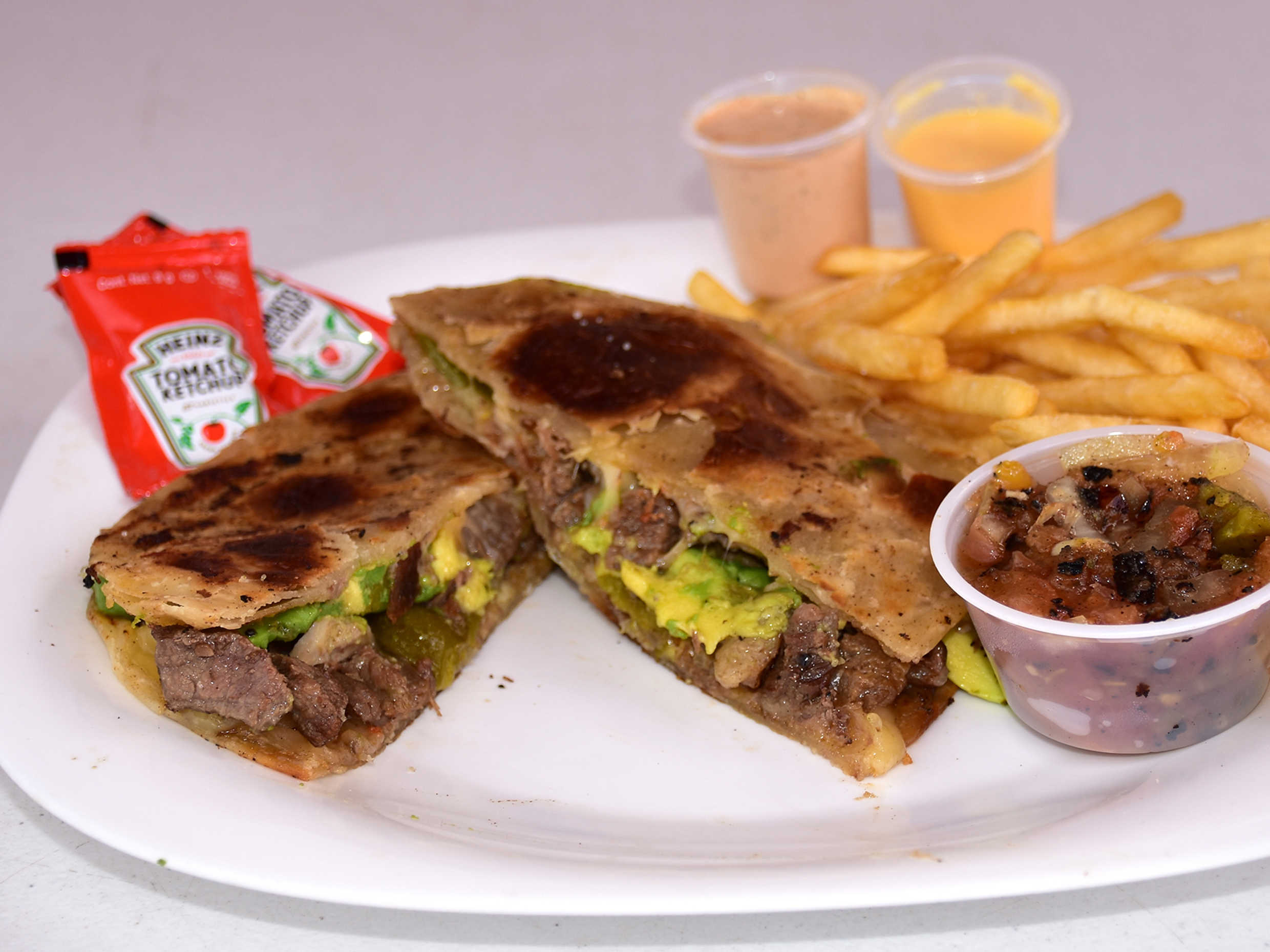 Tortilla de harina gordita doble, carne de res, queso chihuahua, aguacate, chile verde, cebollita caramelizada, acompañada con salsa Nice y PAPAS