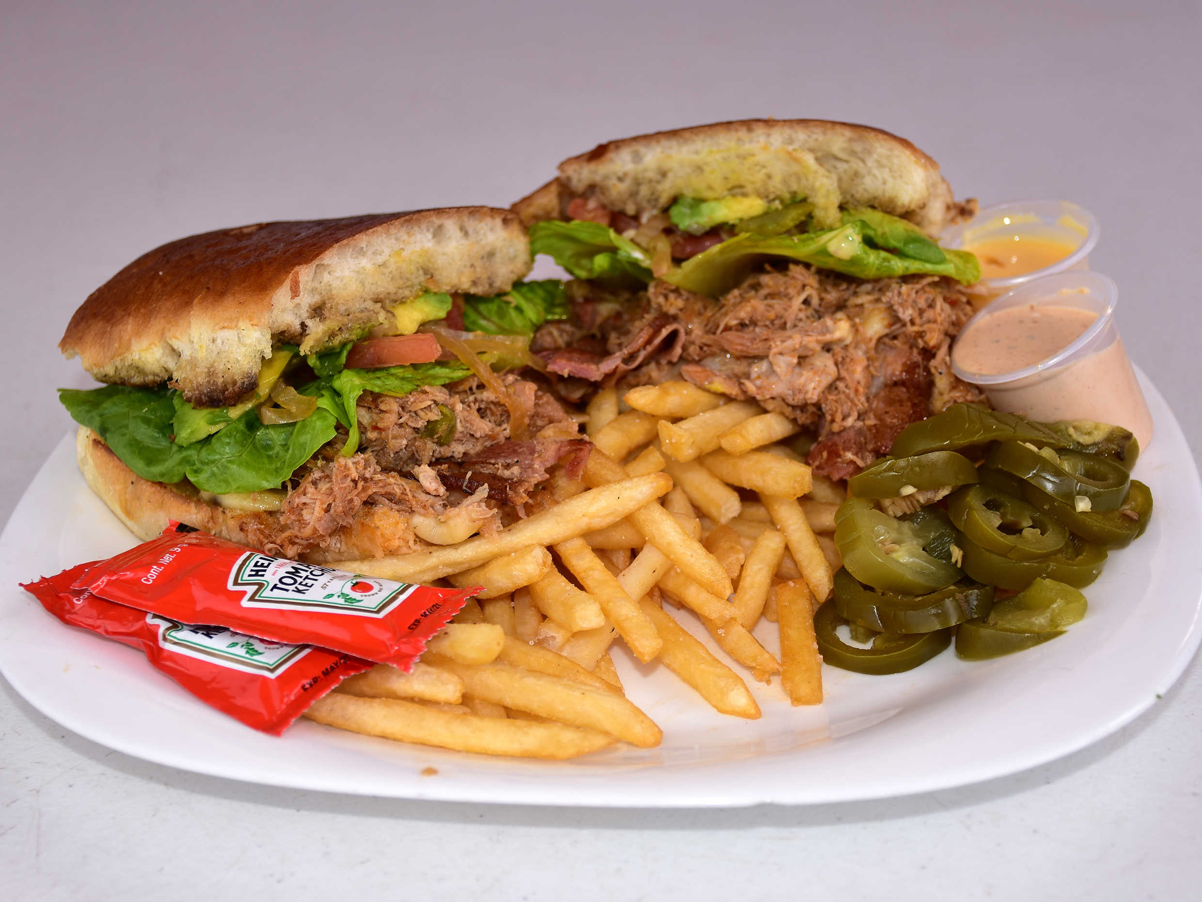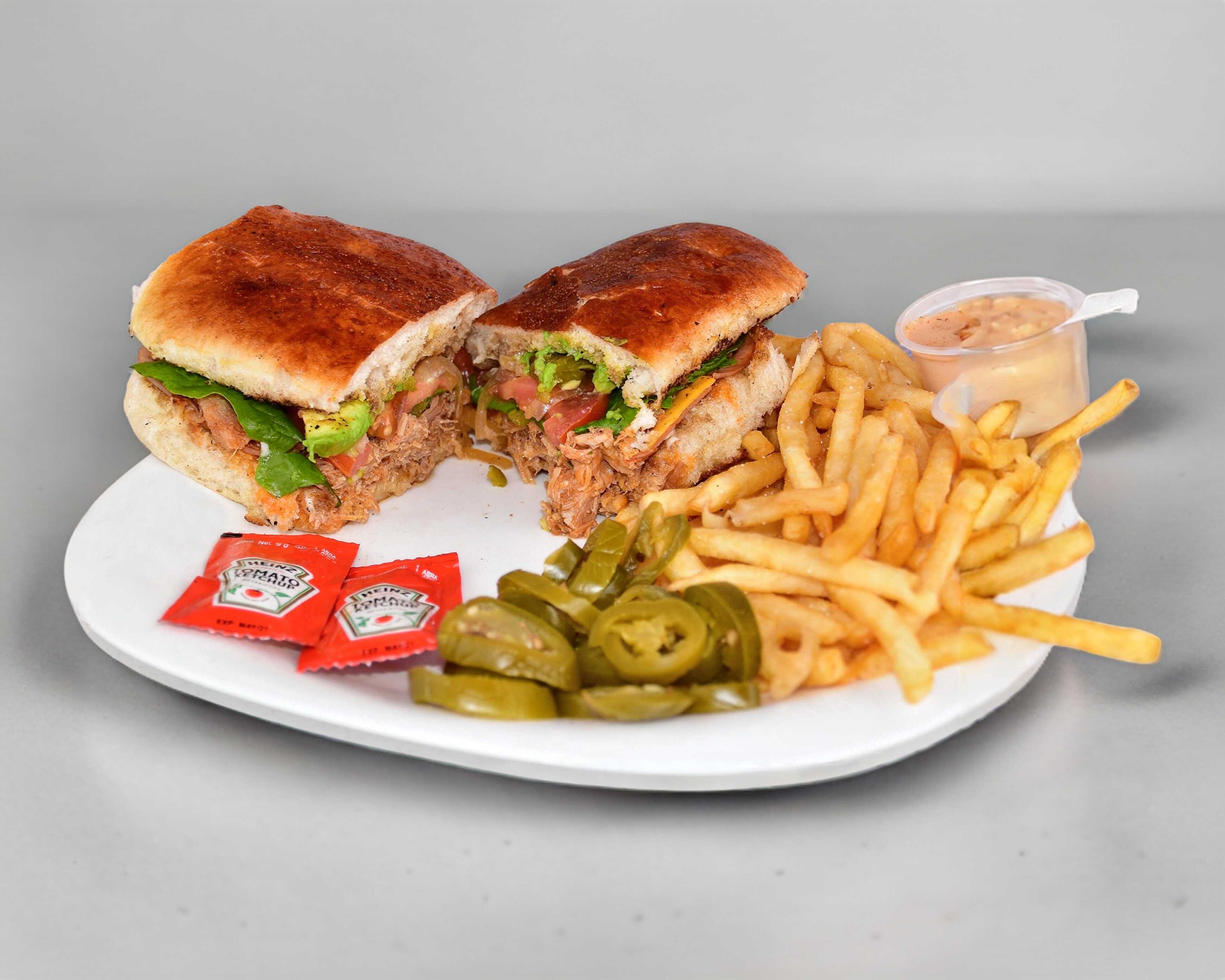 Doble jamón de pierna, doble queso tipo americano, aguacate, tomate, lechuga orejona, cebollita caramelizada, chile verde tatemado y PAPAS.