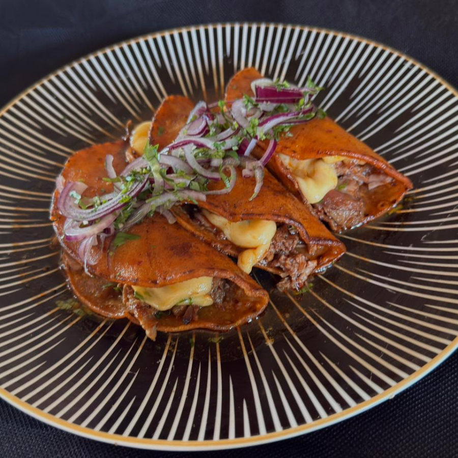 Tortillas doradas con queso derretido y birria jugosa, mas consomé.