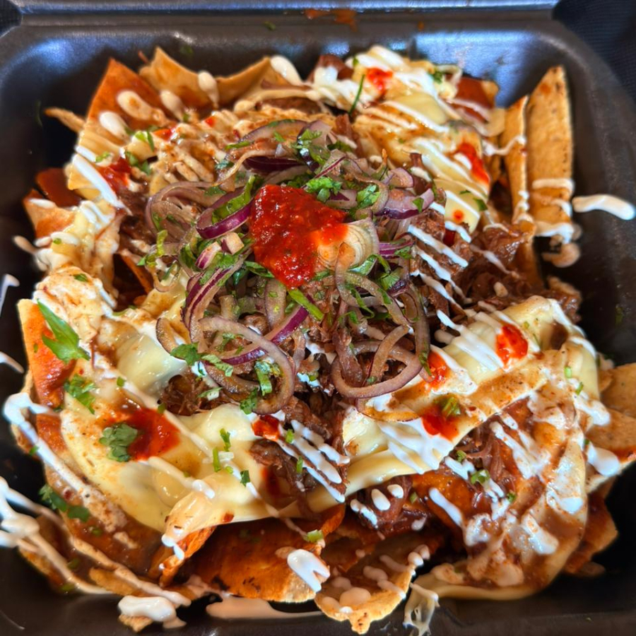 Ricos totopos bañados con la salsa secreta, queso fundido y jugosa birria acompañados con consomé y salsa la casa.