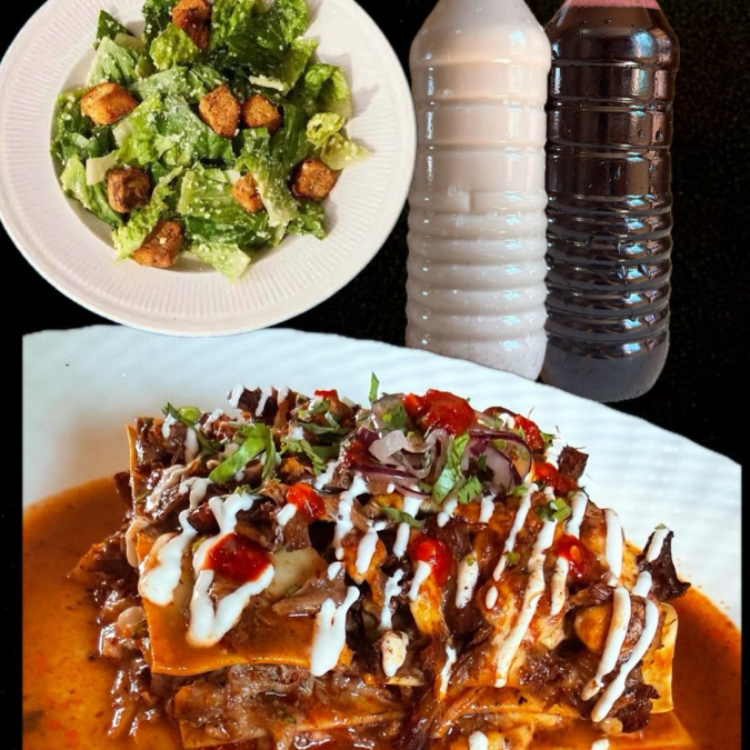 LASAÑA DE BIRRIA*1 + ENSALADA CESAR CON POLLO*1 + Jamaica natural 500ml*1 + Horchata natural 500ml*1
