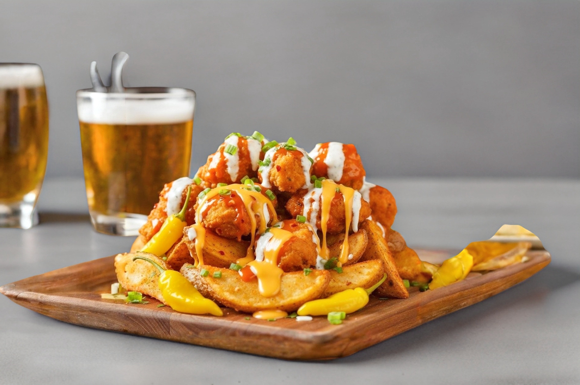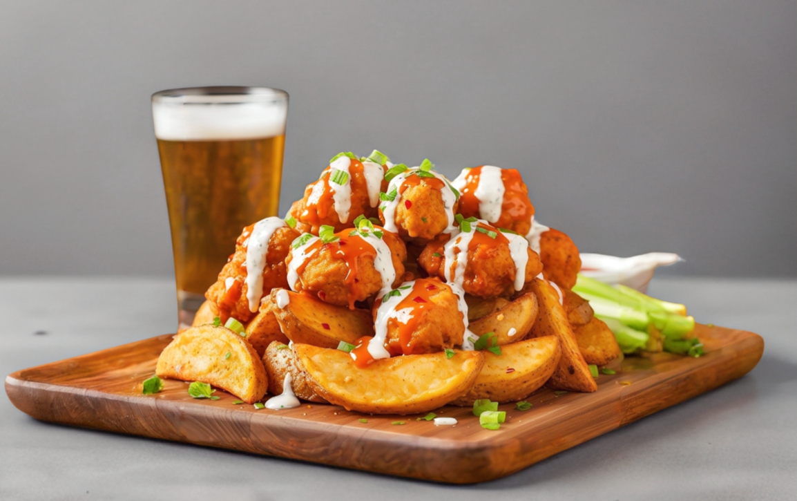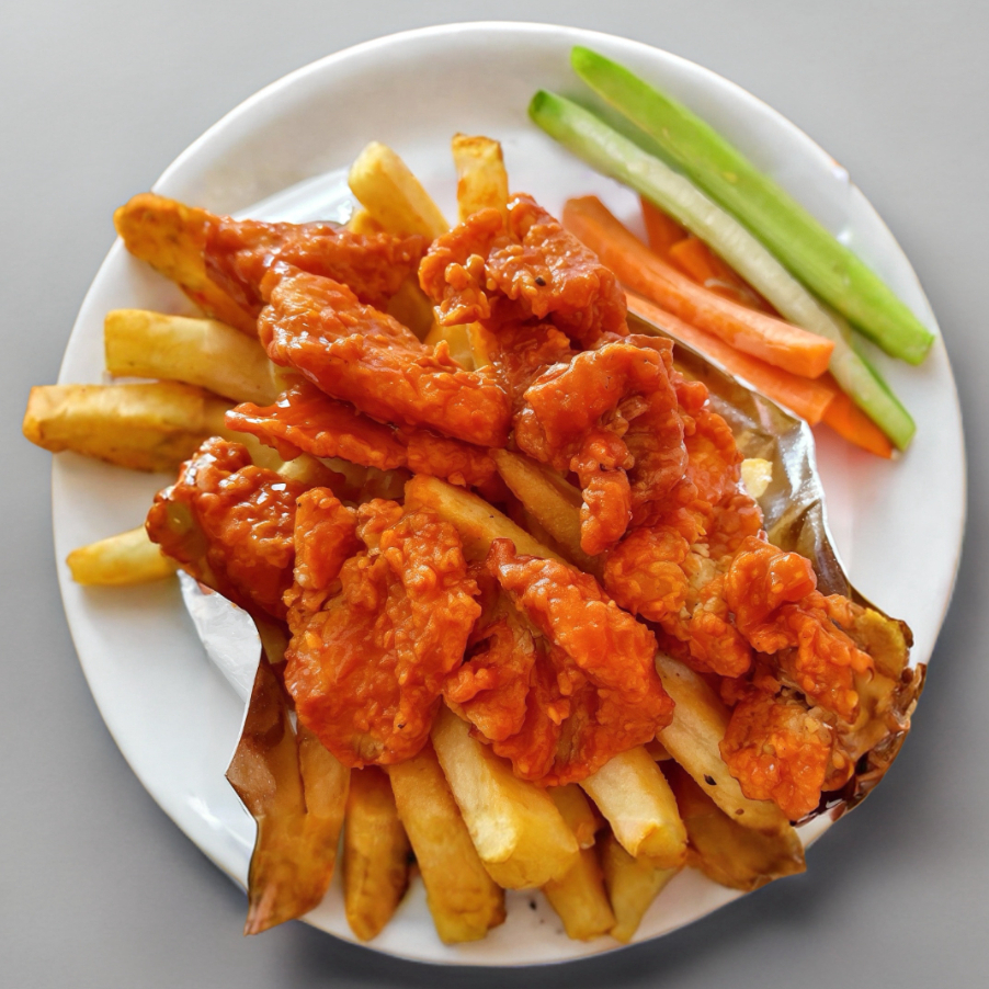 Papas sazonadas + porción de boneless con salsa a elegir + queso cheddar + veggies + aderezo.