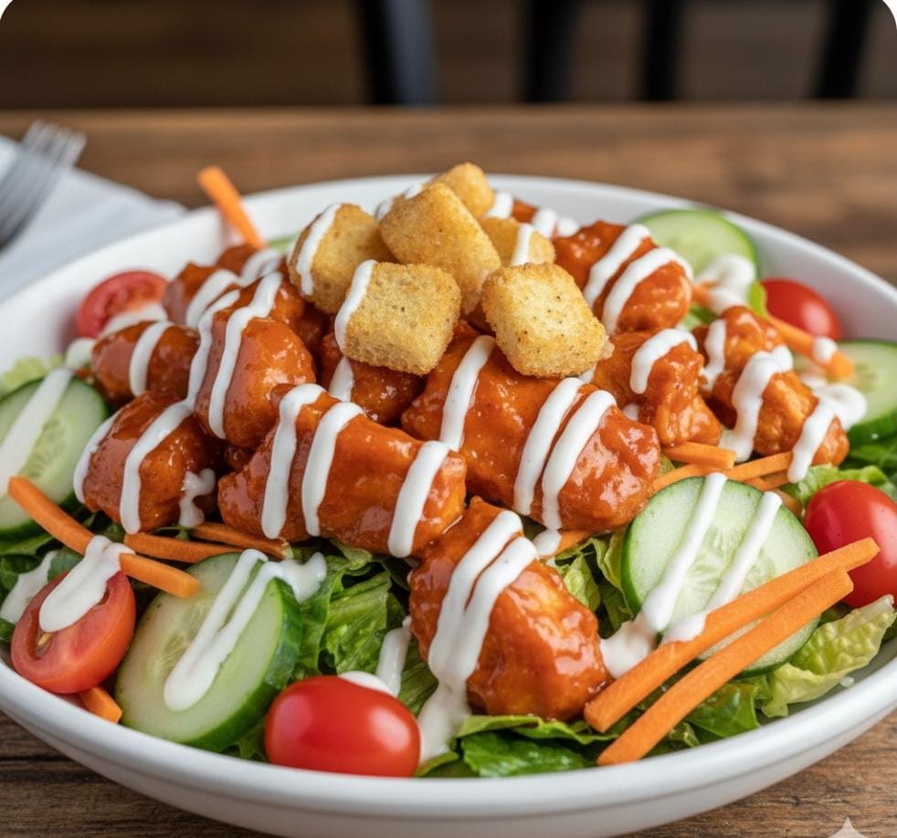 Porción de boneless bañados en salsa de tu salsa favorita + mix de lechugas + zanahoria + pepino + crutones + tomate cherry + aderezo.