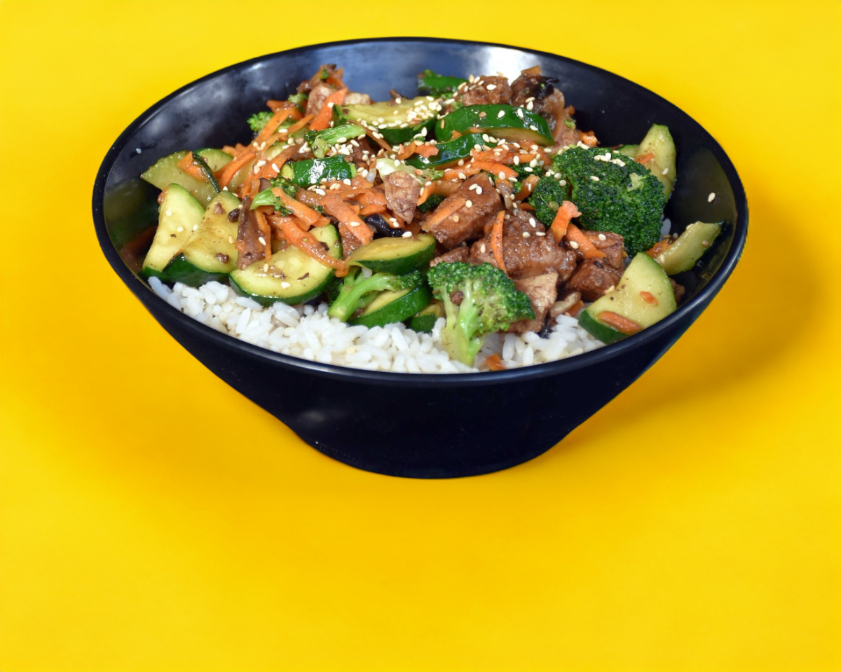 Cama de arroz, champiñones, pollo oriental, zanahoria rallada, calabacita, brócoli y ajonjolí.