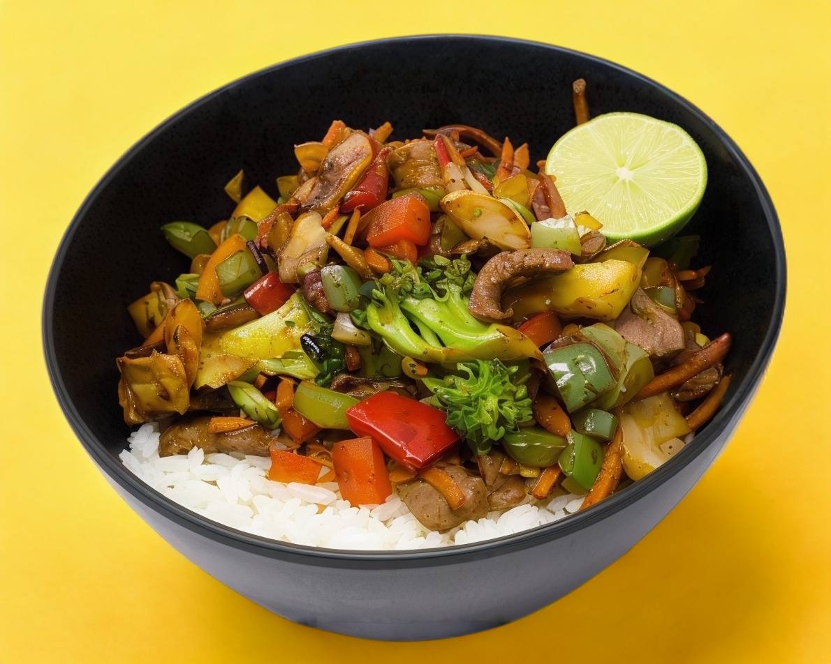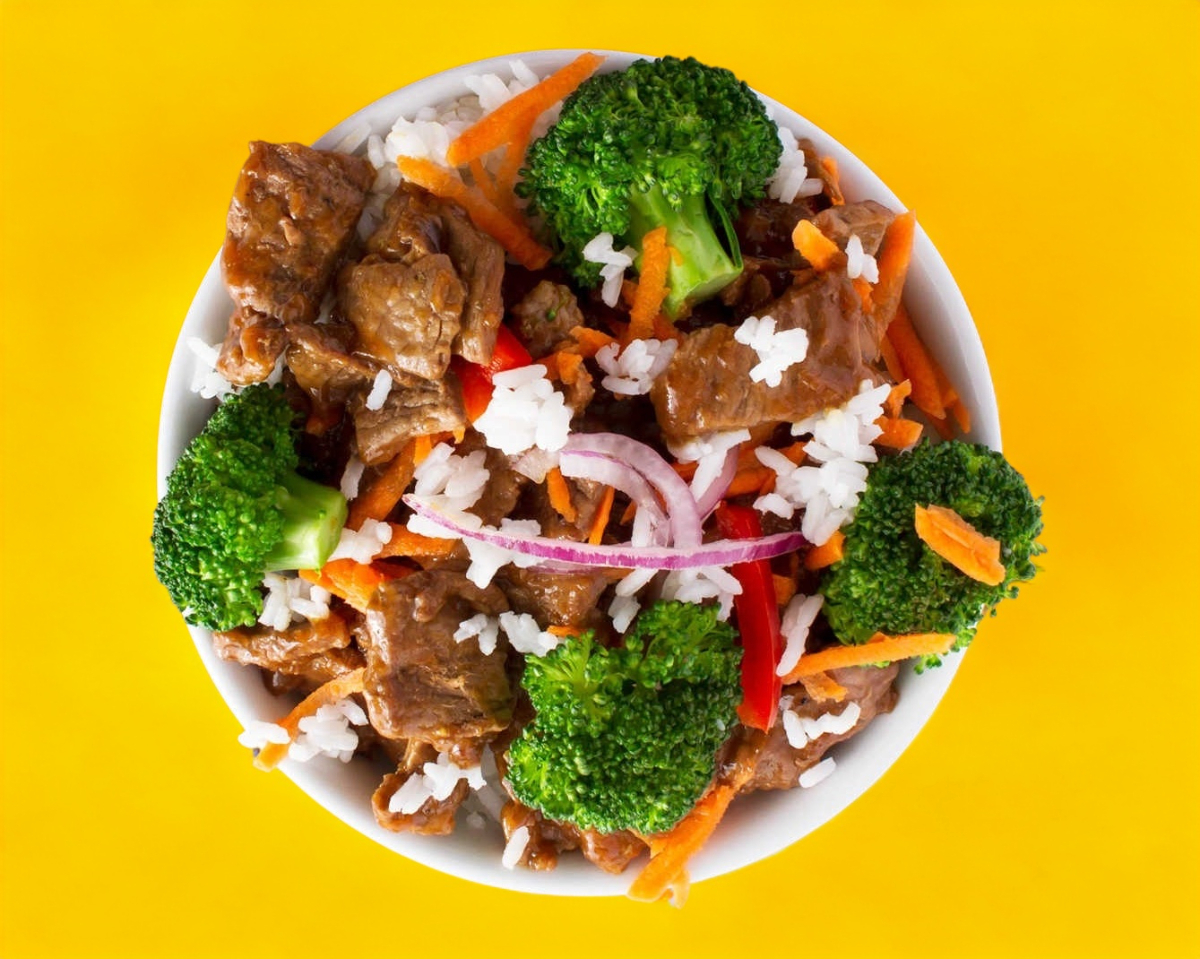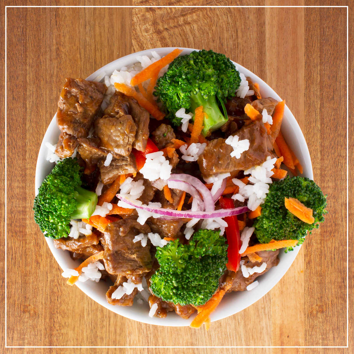 Cama de arroz, filete de res con salsa teriyaki, zanahoria rallada, brócoli, pimiento ojo, champiñones y piña.