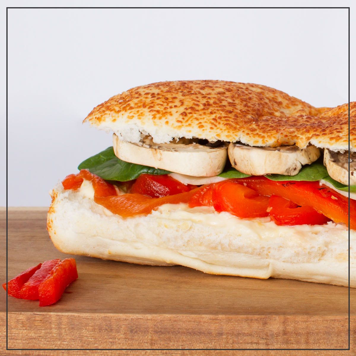 Pimiento morrón tatemado, champiñones asados, espinaca, queso manchego, mayonesa y tomate.