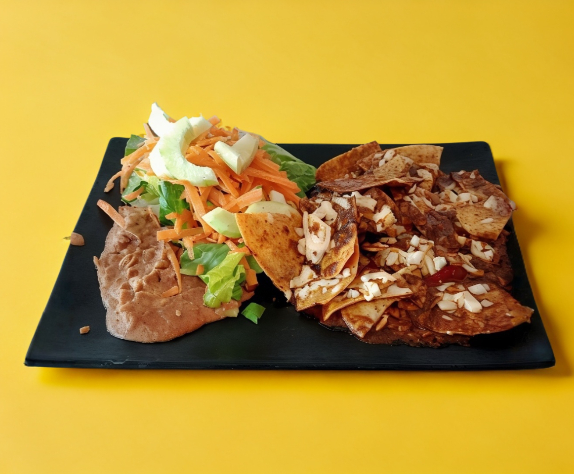 Salsa roja o verde, queso, media crema, acompañado de frijol y verdura.