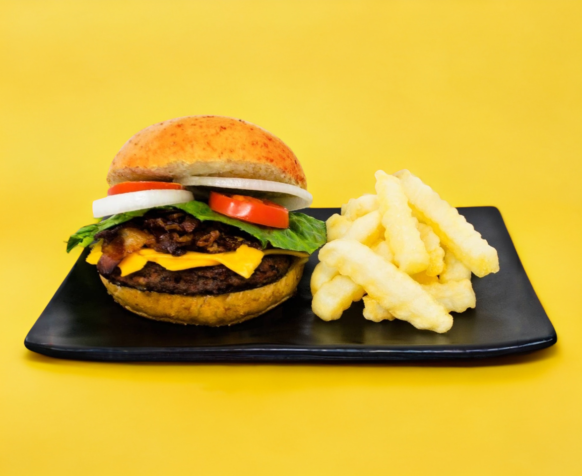 100% Carne de res, tomate, lechuga, cebolla, queso amarillo, tocino, mayonesa. Acompañada con orden de papas fritas y aderezo.