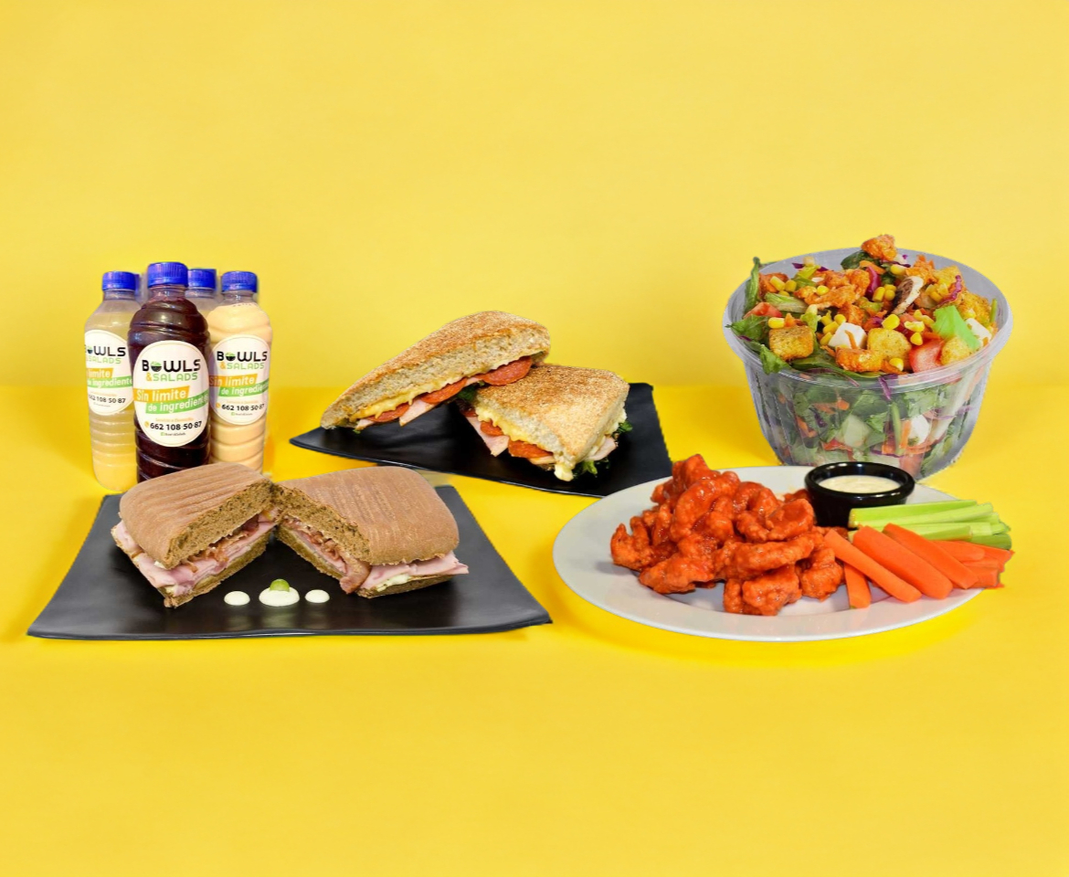 Base de lechuga, proteína a elegir , aderezo, vinagreta, complemento y barra fría . elige tus ingredientes