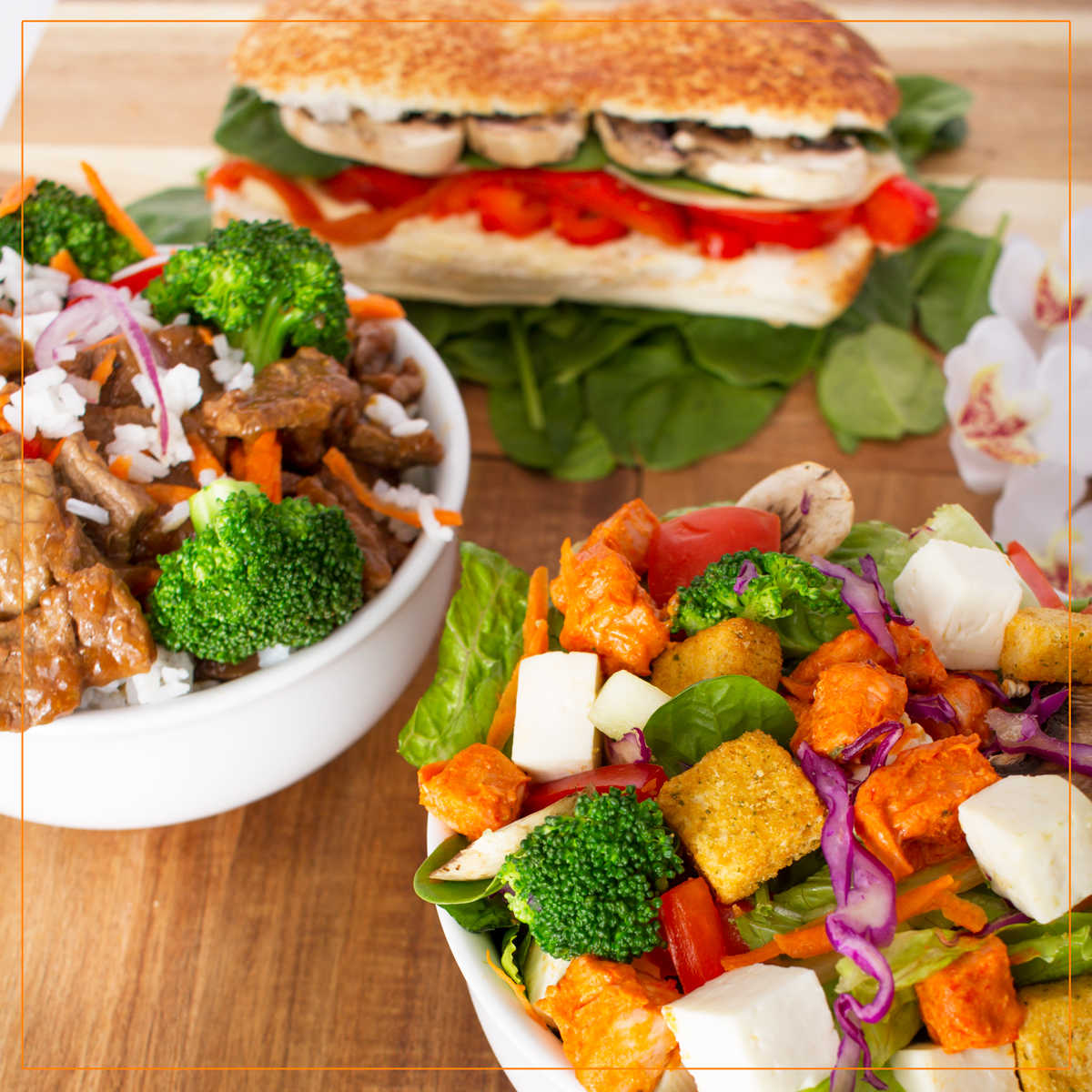 Cama de arroz, proteína, aderezo, vinagreta, complemento y barra fría sin limites.