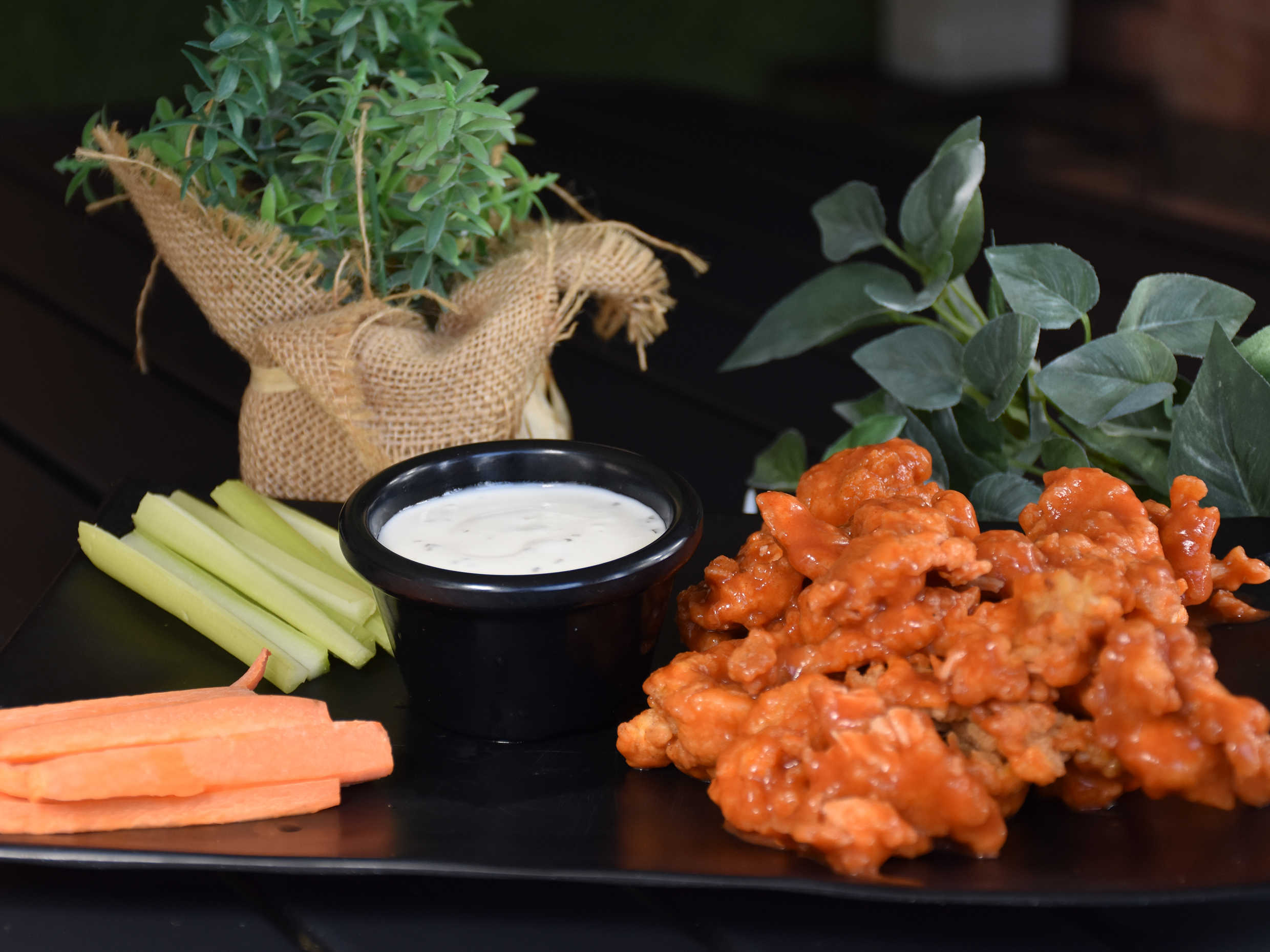 Pollo boneless con salsa mango habanero, búfalo o BBQ, apio, zanahoria y aderezo ranch.