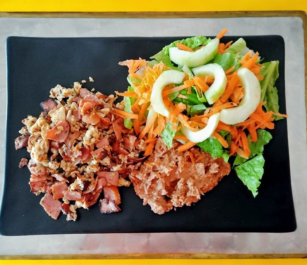 Huevo, jamón, queso, acompañado de frijol y verdura.
