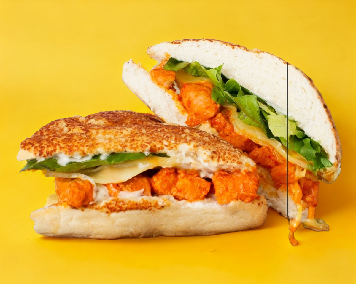 (200grs) Pollo búfalo, queso manchego, lechuga, aderezo ranch y tomate. Picante.