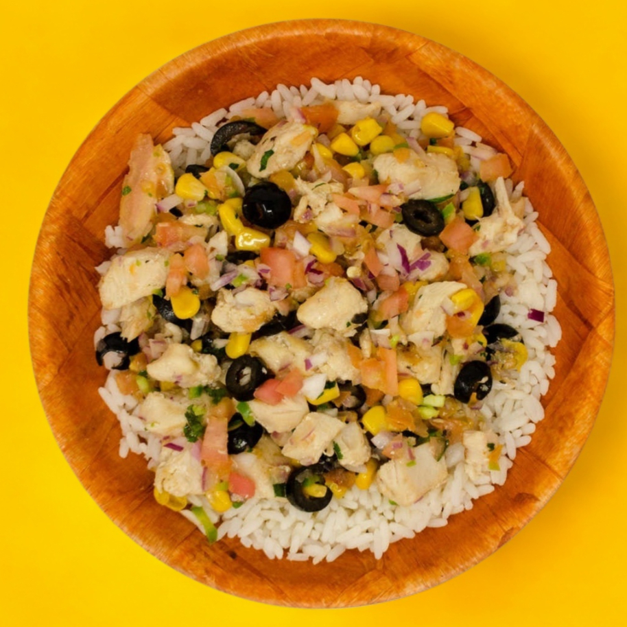 Cama de arroz, filete de pollo, pico de gallo, elote, frijol negro, cilantro y cebolla morada. Picante.
