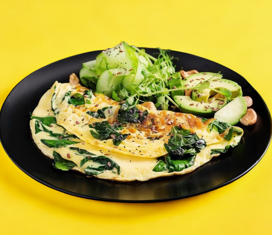 Huevo, espinaca, champiñón, acompañado de frijol y verdura.