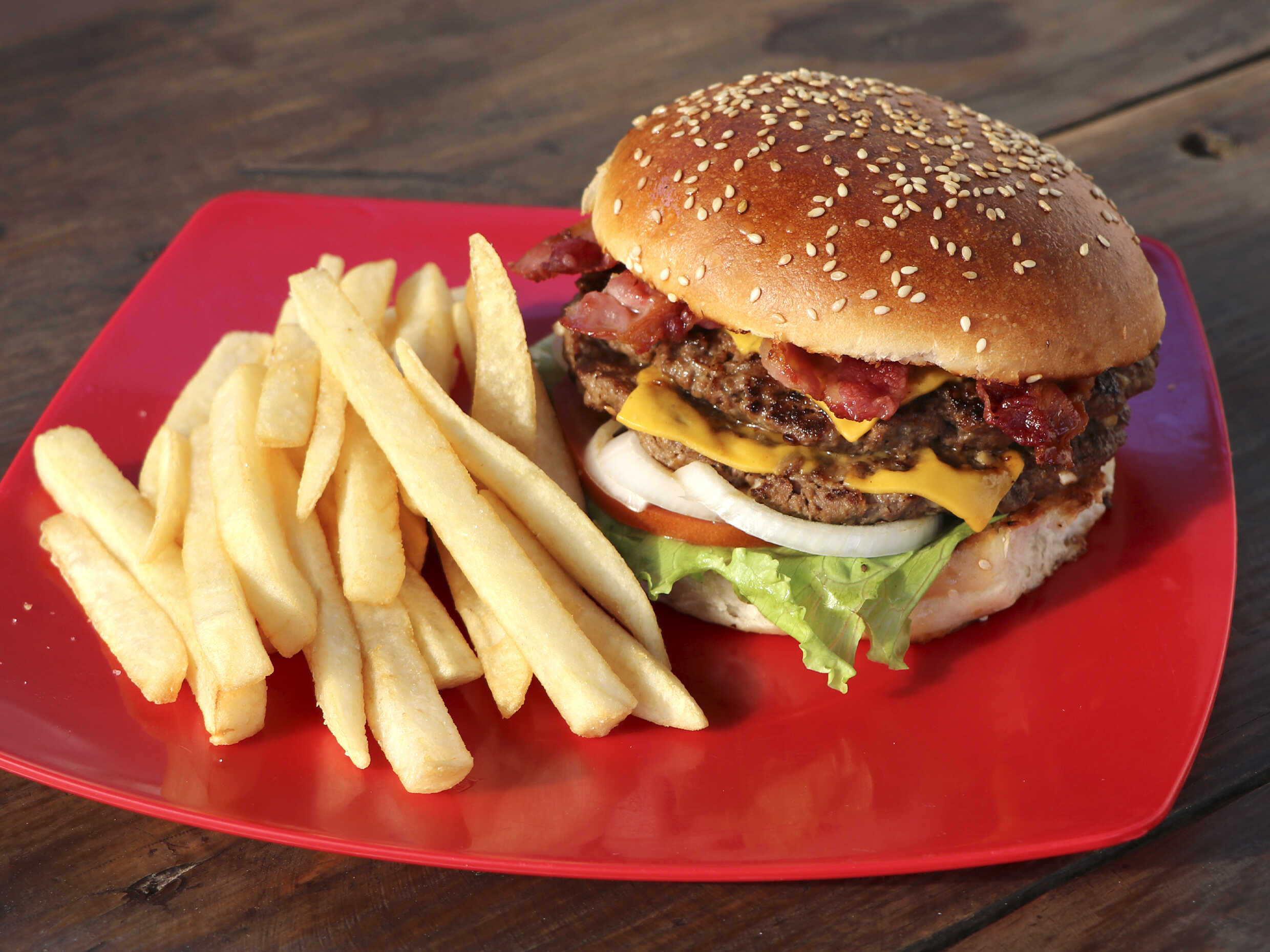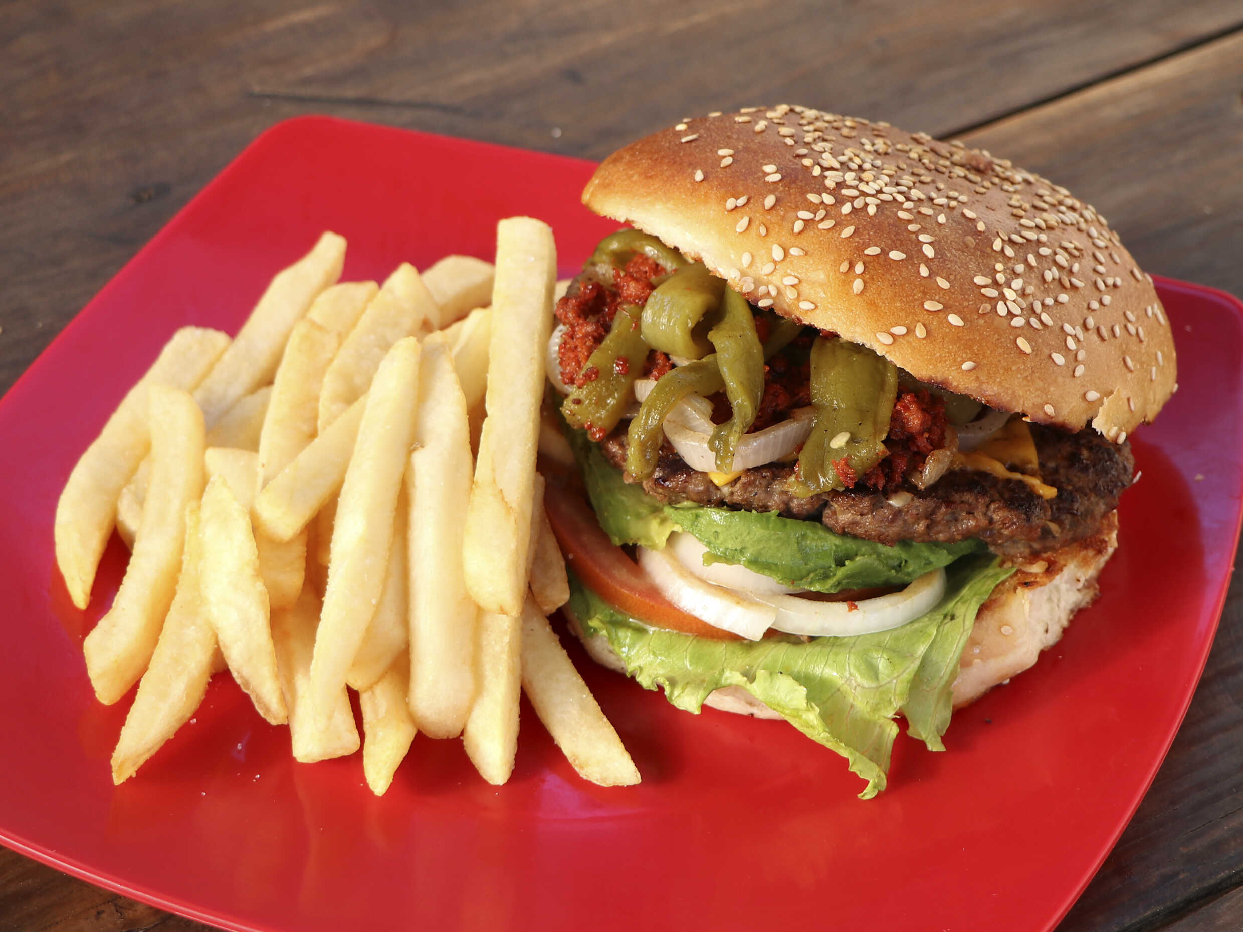 doble carne de la casa, queso, tocino, lechuga,tomate, cebolla, aguacate, jalapeño, catsup y papas.