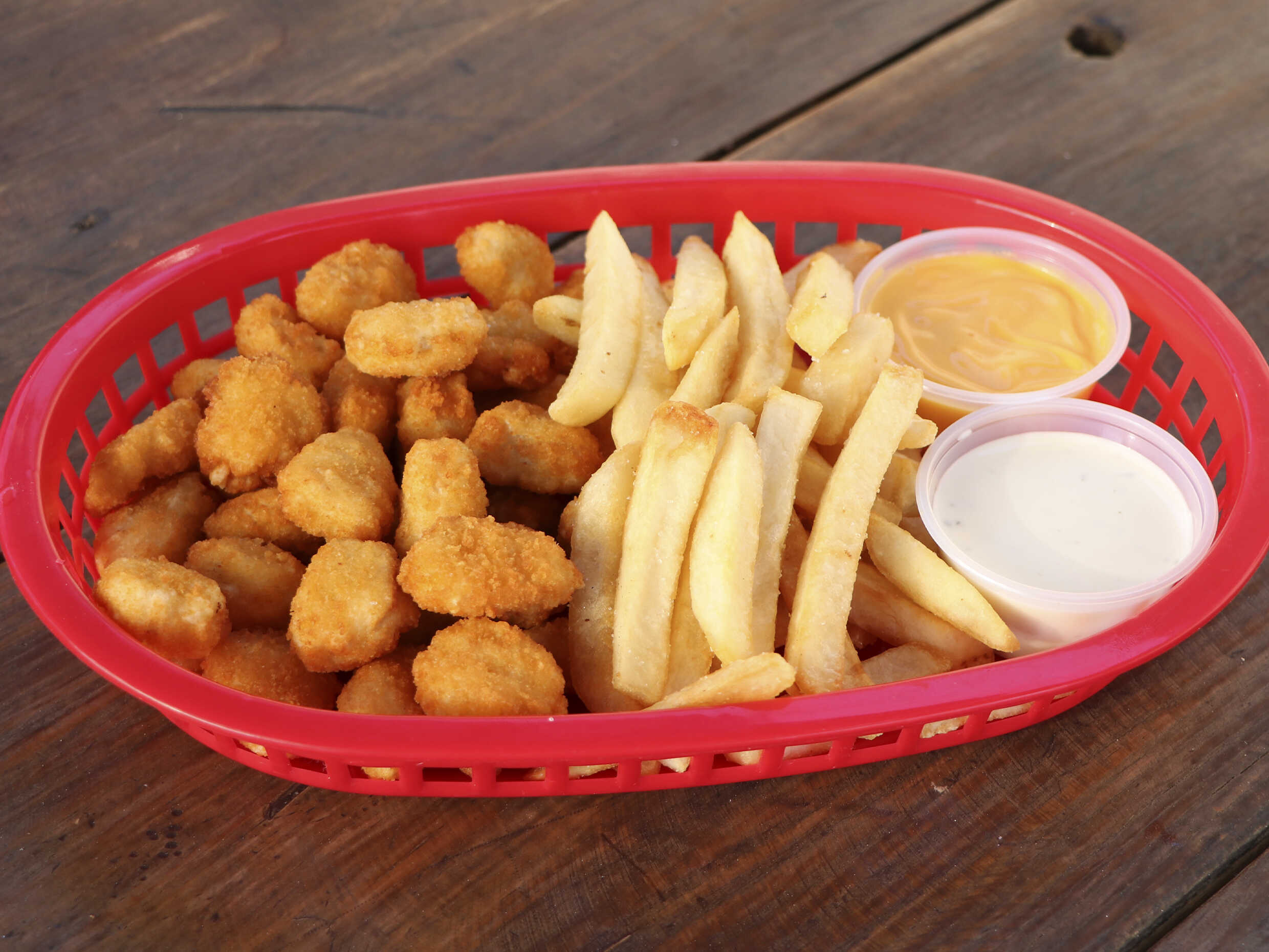 palomitas de pollo 250gr. acompañada de papas fritas catsup y queso amarillo.