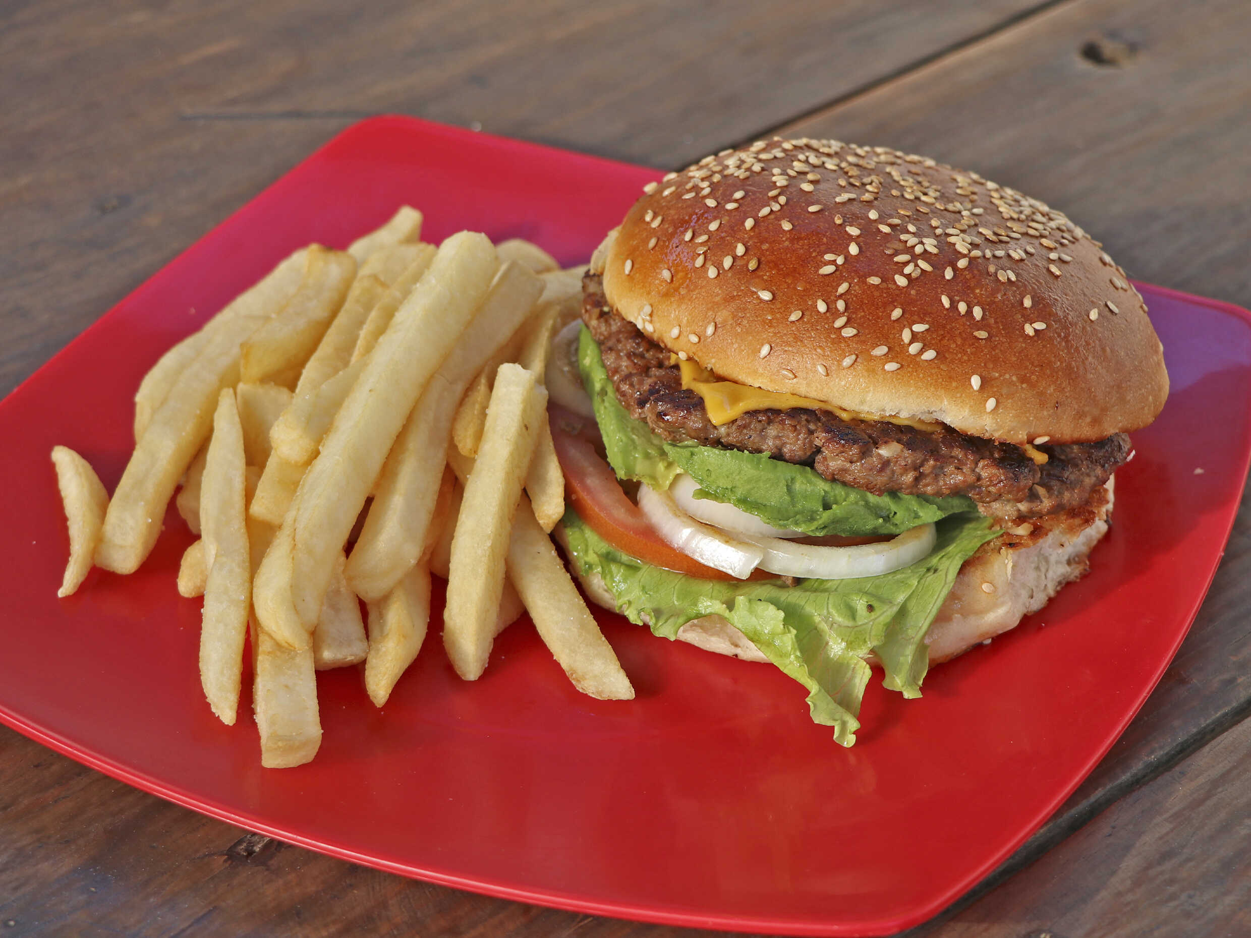 carne de la casa, queso, lechuga, tomate, cebolla, aguacate, jalapeños, catsup y papas francesas