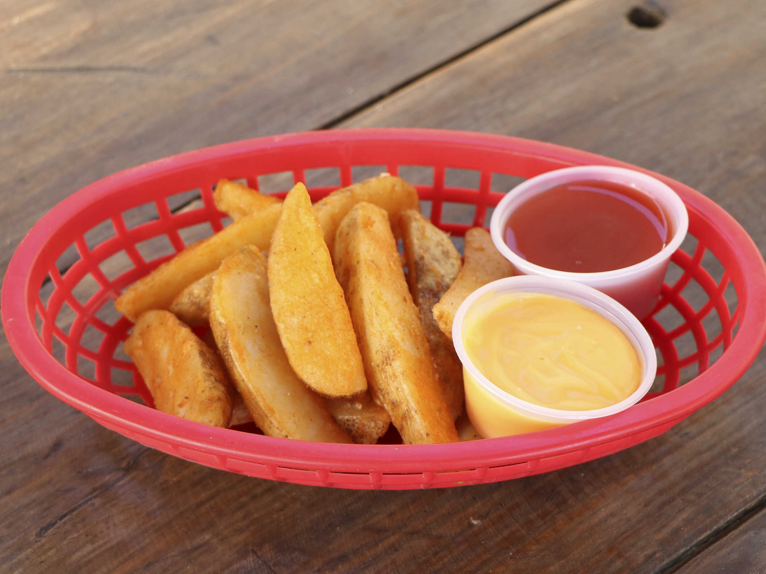 papas sazonadas acompañadas de queso amarillo y catsup.