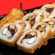 Rollo de sushi relleno de queso philadelphia, aguacate fresco, carne de res, pollo y tocino crujiente.