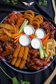 Tiras de pechuga de pollo empanizadas y bañadas en salsa a elegir, acompañadas de zanahoria, apio y aderezo.