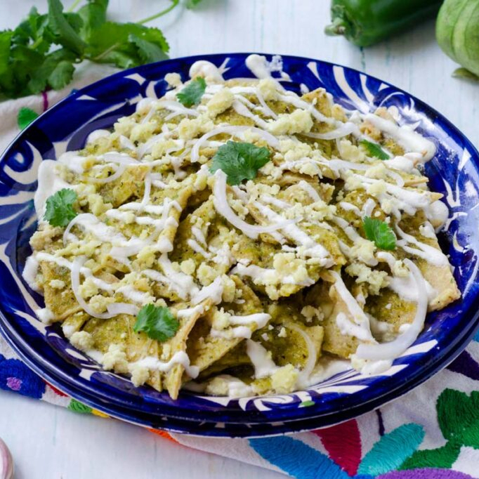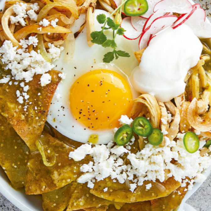 Tortillas fritas , queso , salsa verde , huevo , crema y verdura