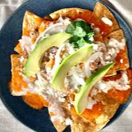 Tortilla fritas , salsa roja , huevo , verdura y crema