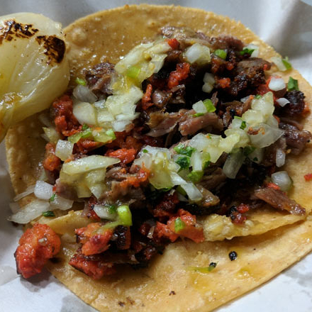 Asada , queso , verdura y salsas + un taquito de frijol gratis