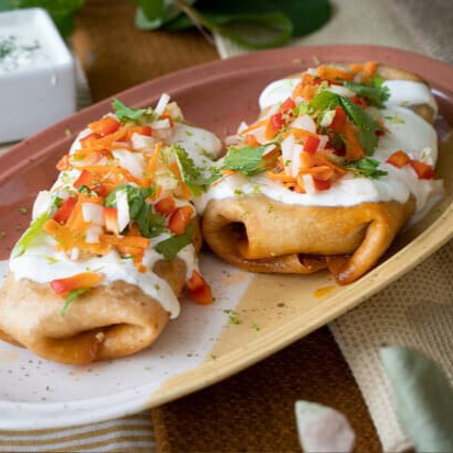 Tortilla gordita , carne con chile , queso , verdura y salsas