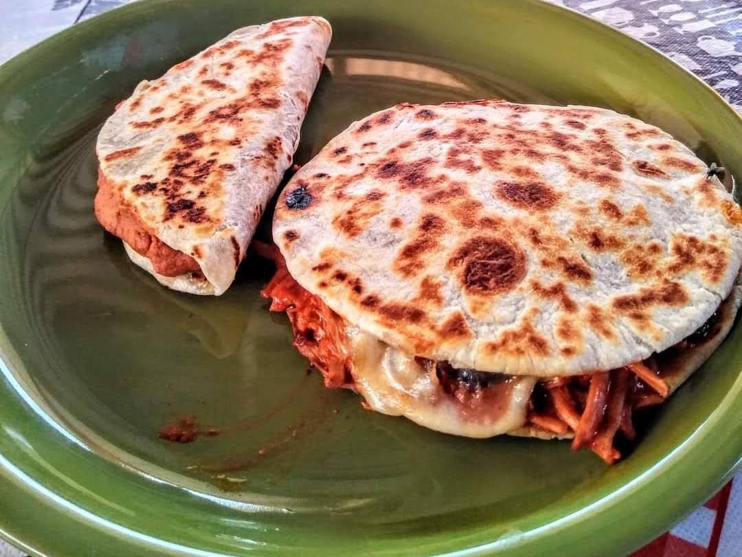 Quesadilla de tortilla de harina gordita y queso. Los ojos Guiso a elegir y taquito de frijol regalado.