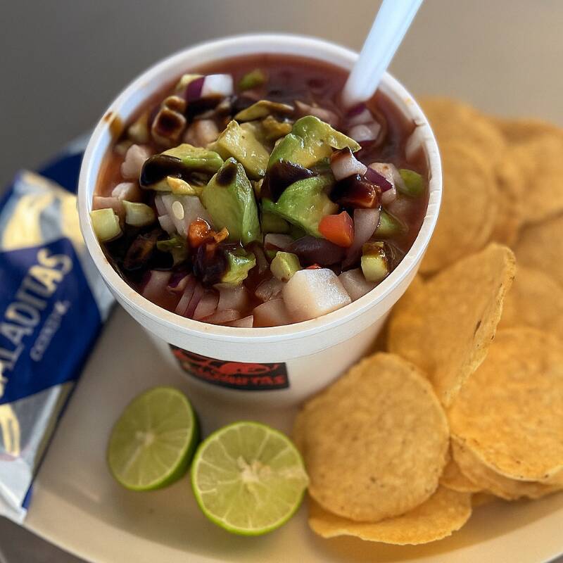 Medio litro de ceviche de camarón pulpo y pescado con totopos