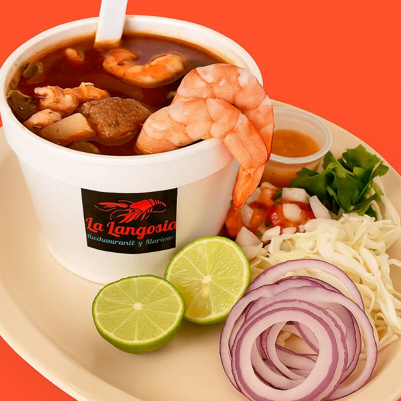 Medio litro de jugo con camarones y aleta totopos salsa y verdura