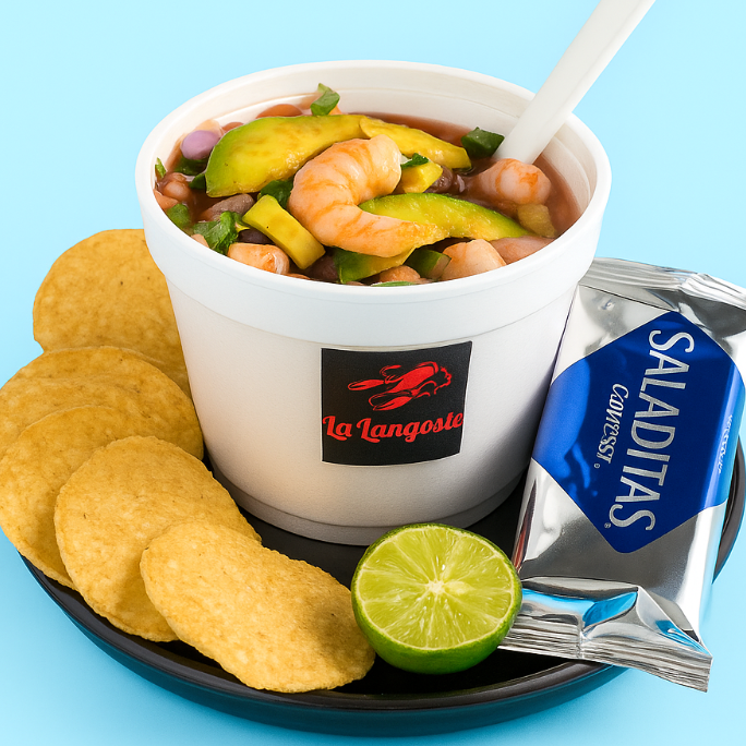 Medio litro de ceviche de camarón con salseado con totopos