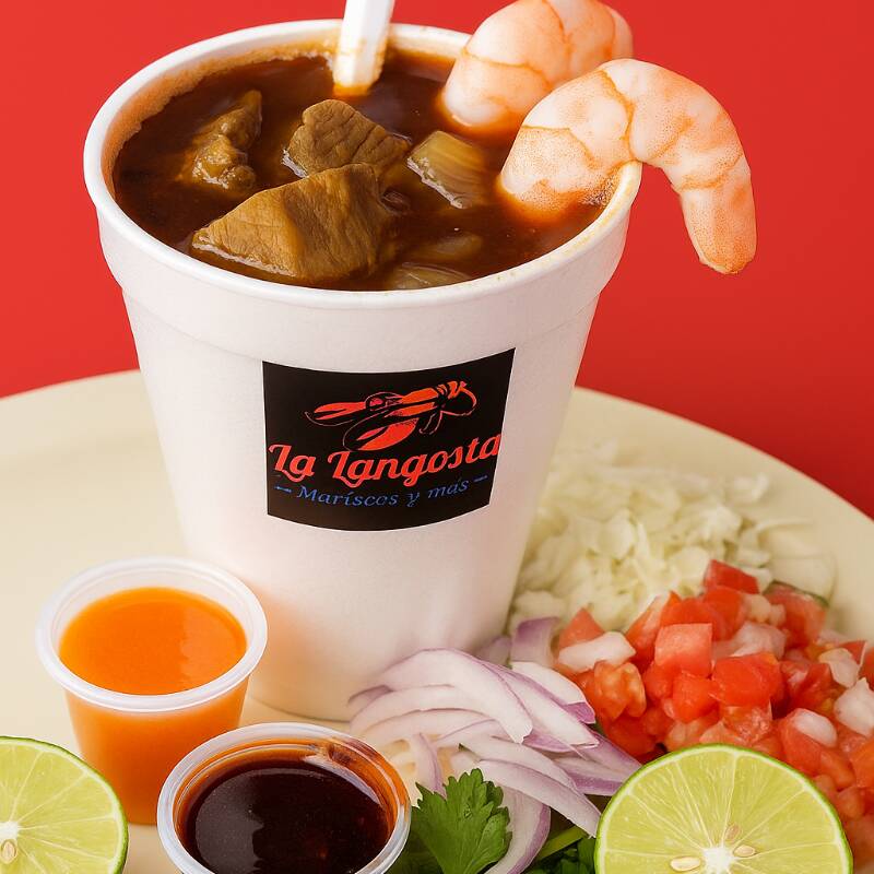 Vaso del núm 12 con jugo de caguamanta con camarones y aleta totopos y verdura
