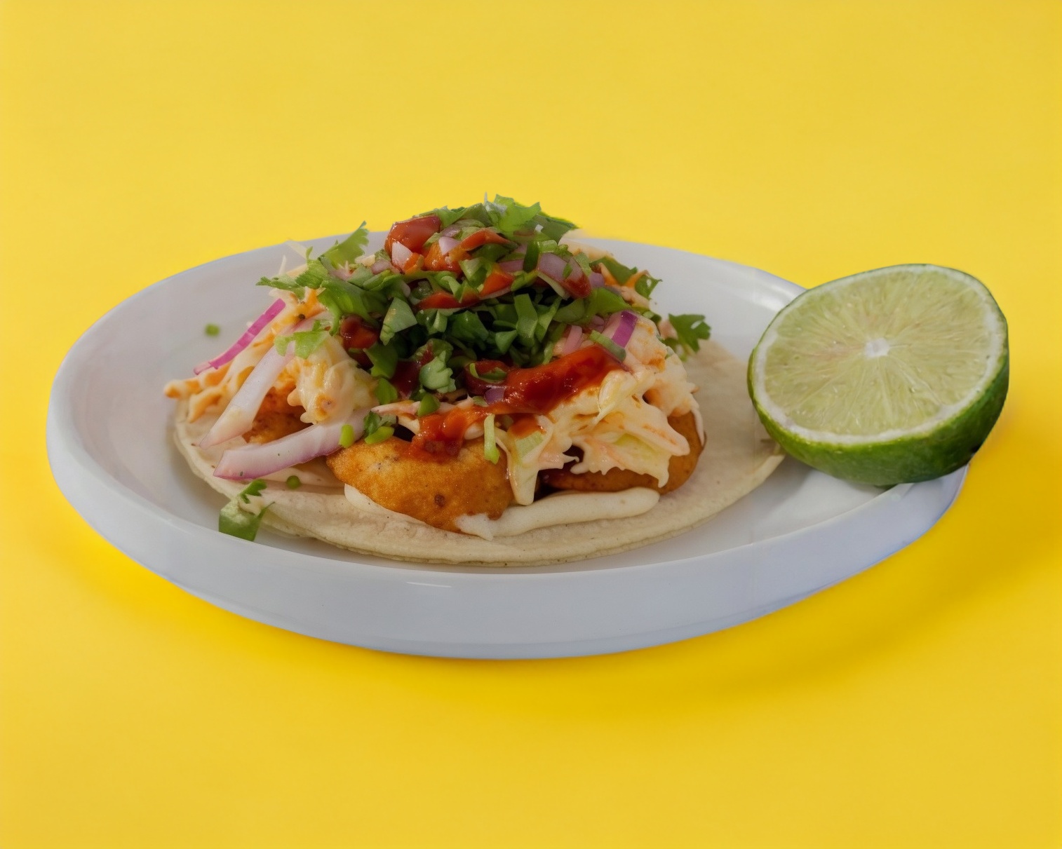 Tortilla de maiz, con aderezo de la casa, pescado capeado acompañado de verdura y ensalada de repollo