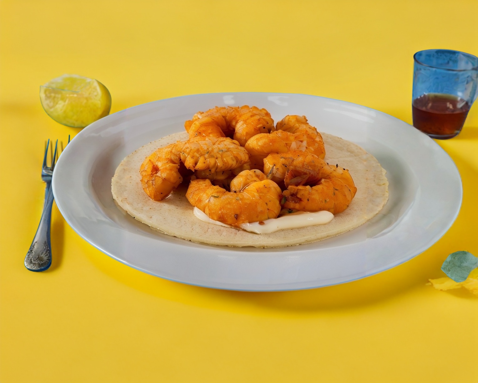 Tortilla de maiz, con aderezo de la casa y camarón capeado. Acompañado de verdura y ensalada de repollo.
