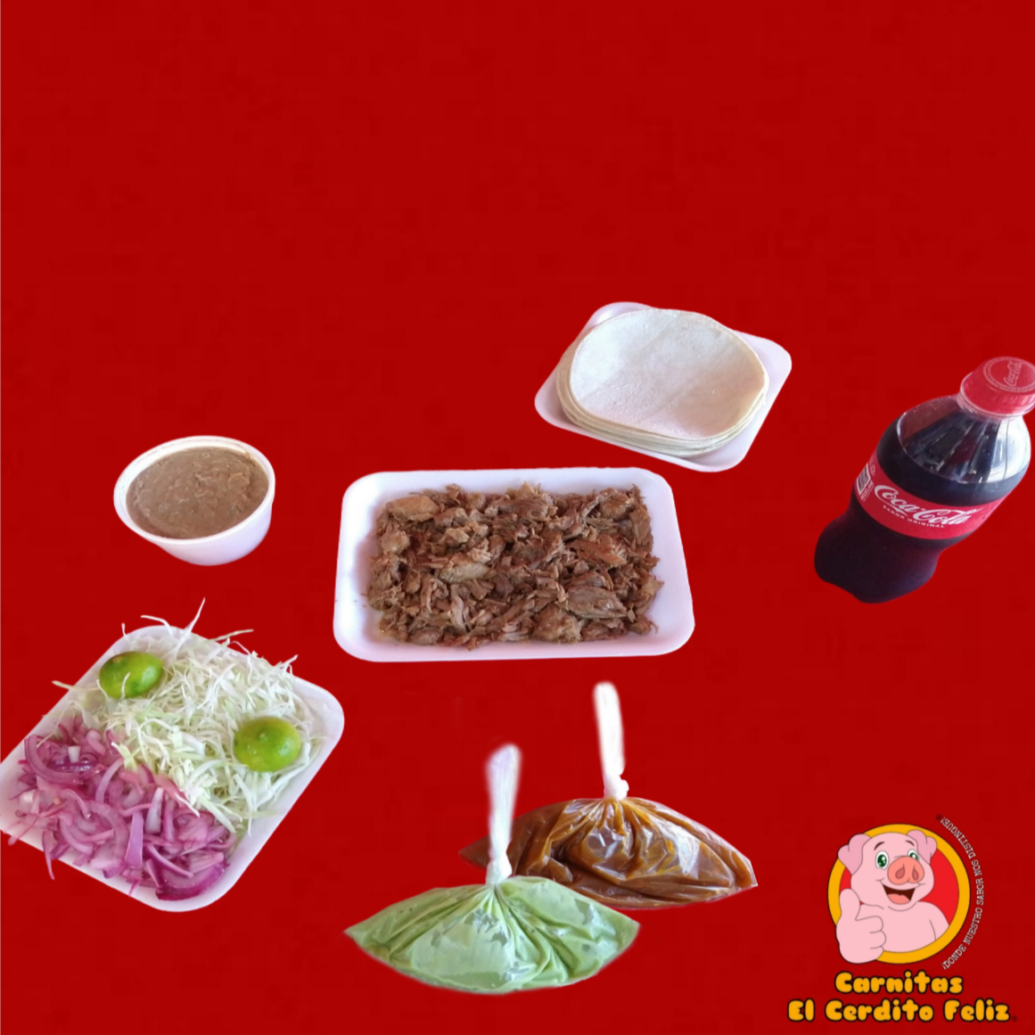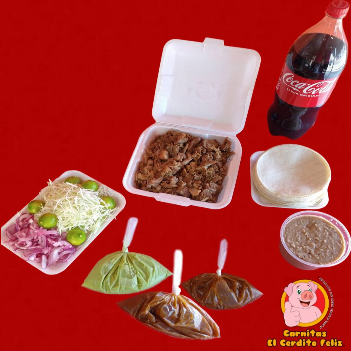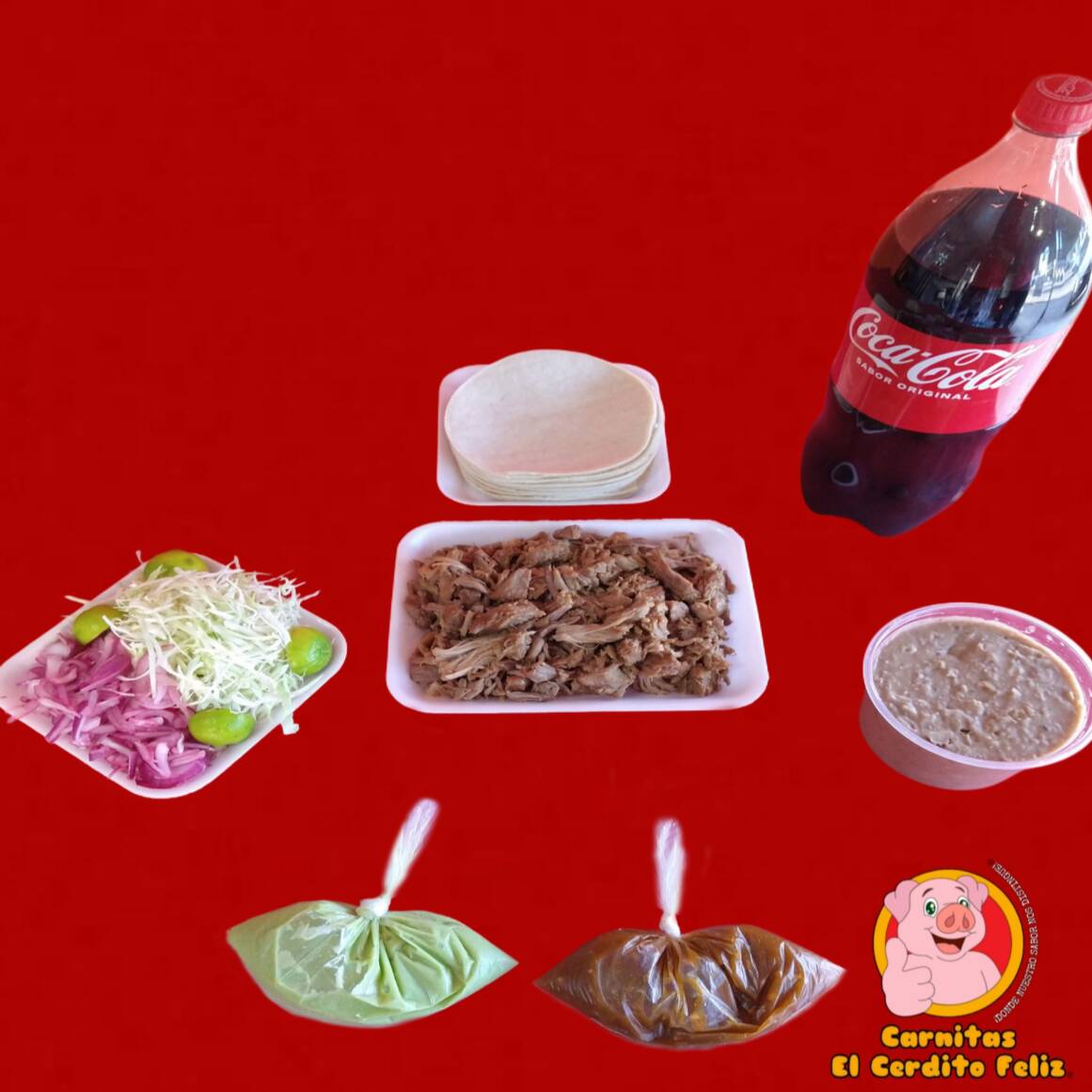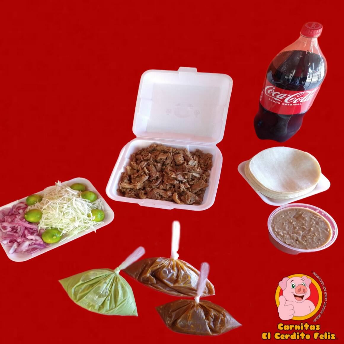1/2 Kilo (500grs.) de Carnitas •Maciza •Cuerito •Surtido 1/2 Lt de Frijoles Preparados (500grs.) 1 Refresco Coca Cola o Sabor 2L El Paquete Incluye: Repollo, Cebolla, Limones, Guacamole, Salsa y Tortillas de Maíz.