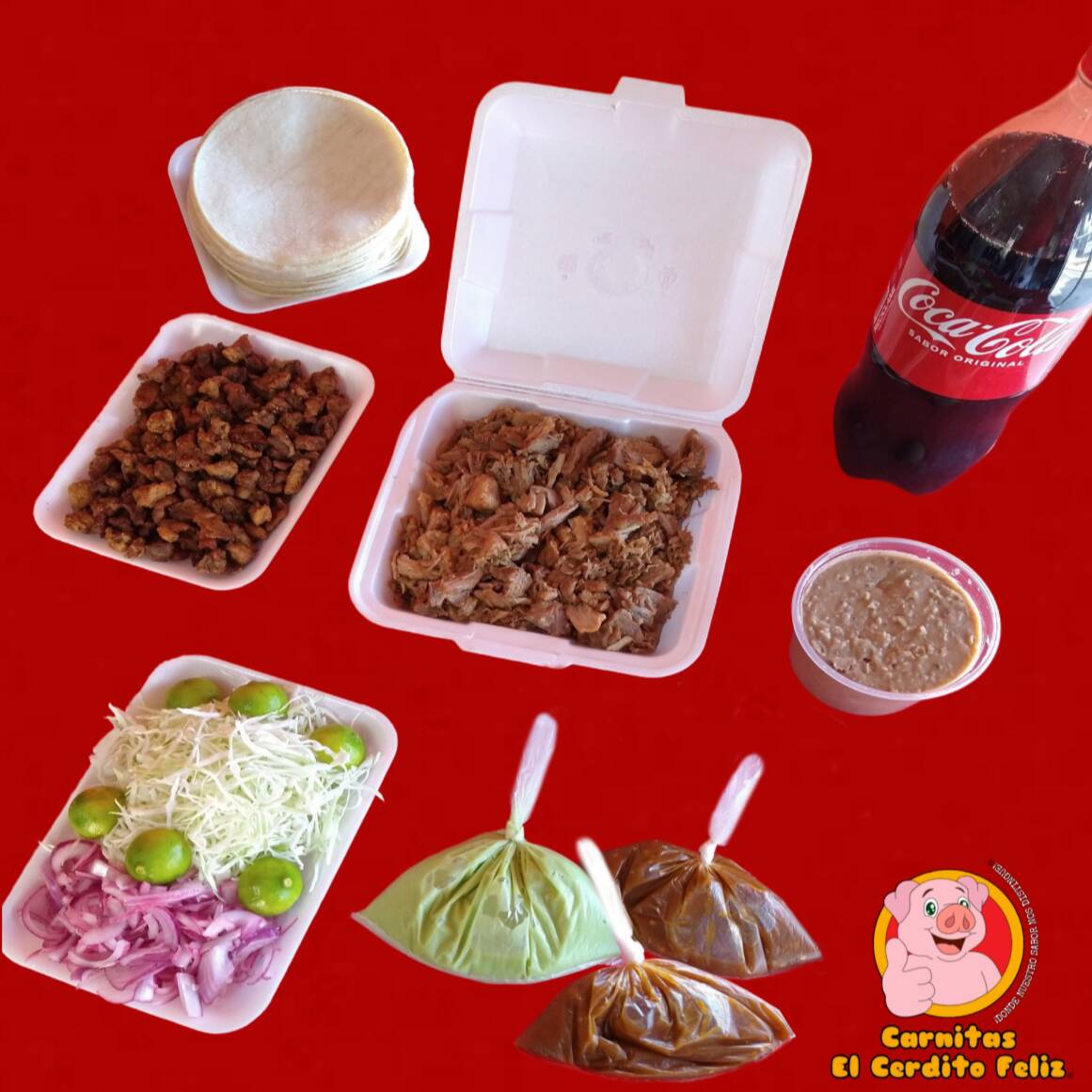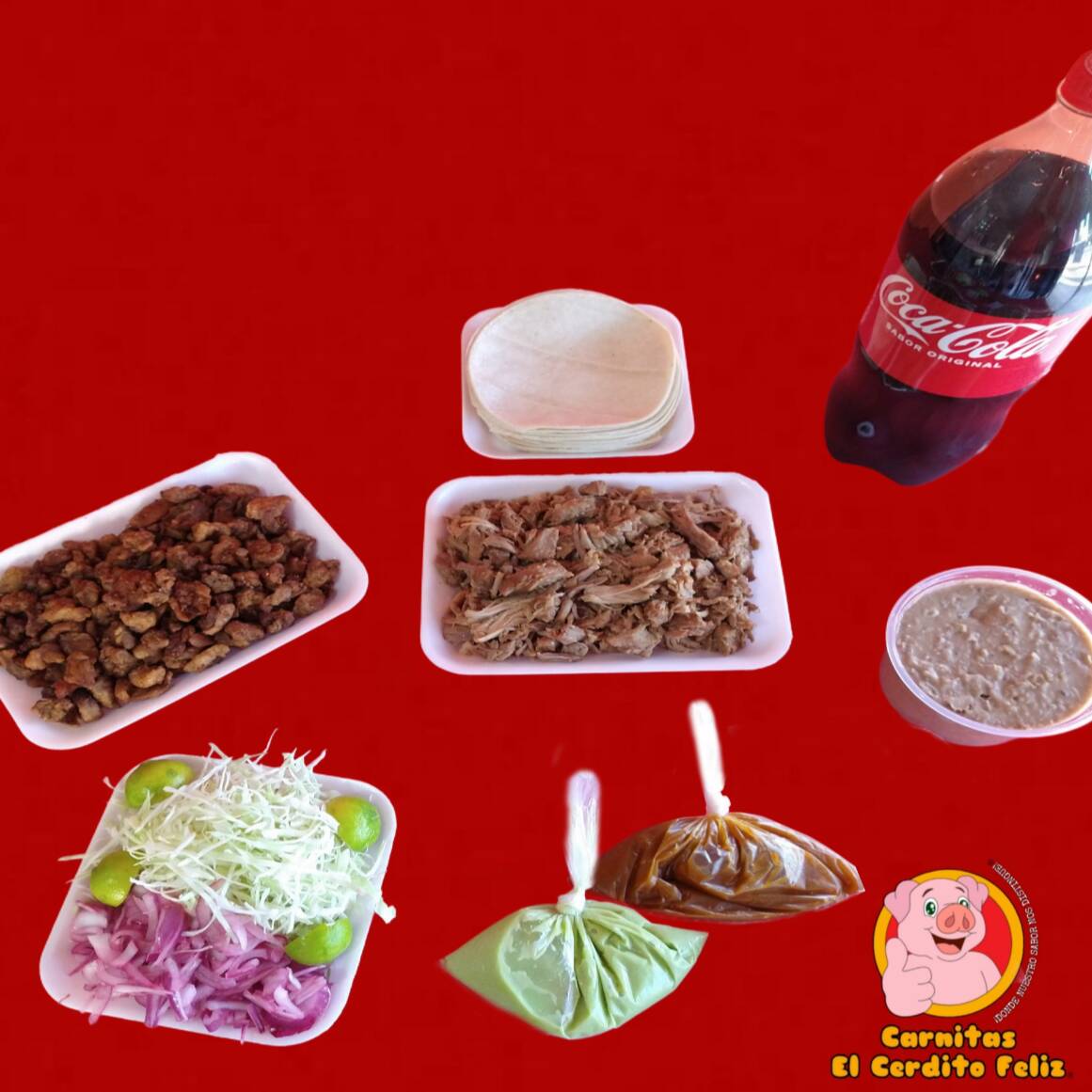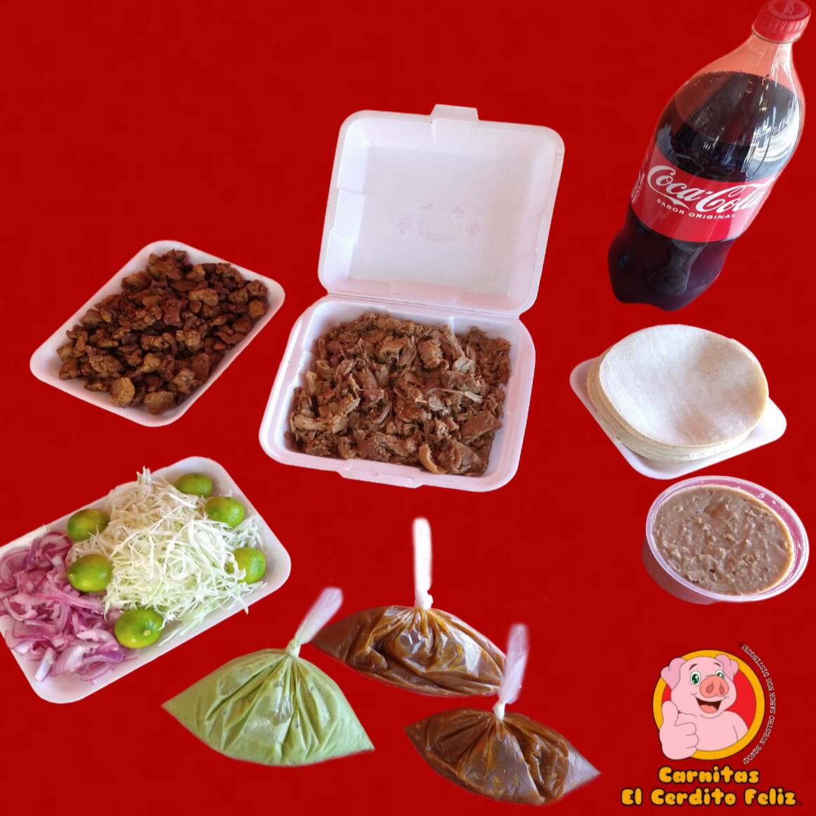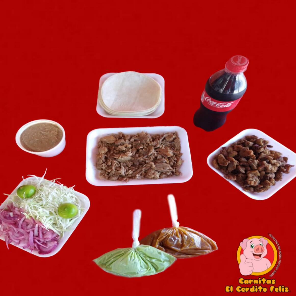 1/2 Kilo (500grs.) de Carnitas •Maciza •Cuerito •Surtido 1/2 Lt de Frijoles Preparados (500grs.) 1 Refresco Coca Cola o Sabor 2L El Paquete Incluye: Repollo, Cebolla, Limones, Guacamole, Salsa y Tortillas de Maíz.