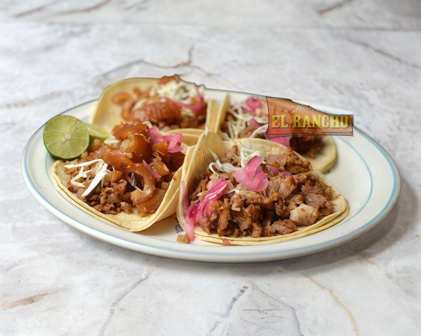 Acompañado de salsa verde y roja, repollo, cebolla morada curtida y limón.