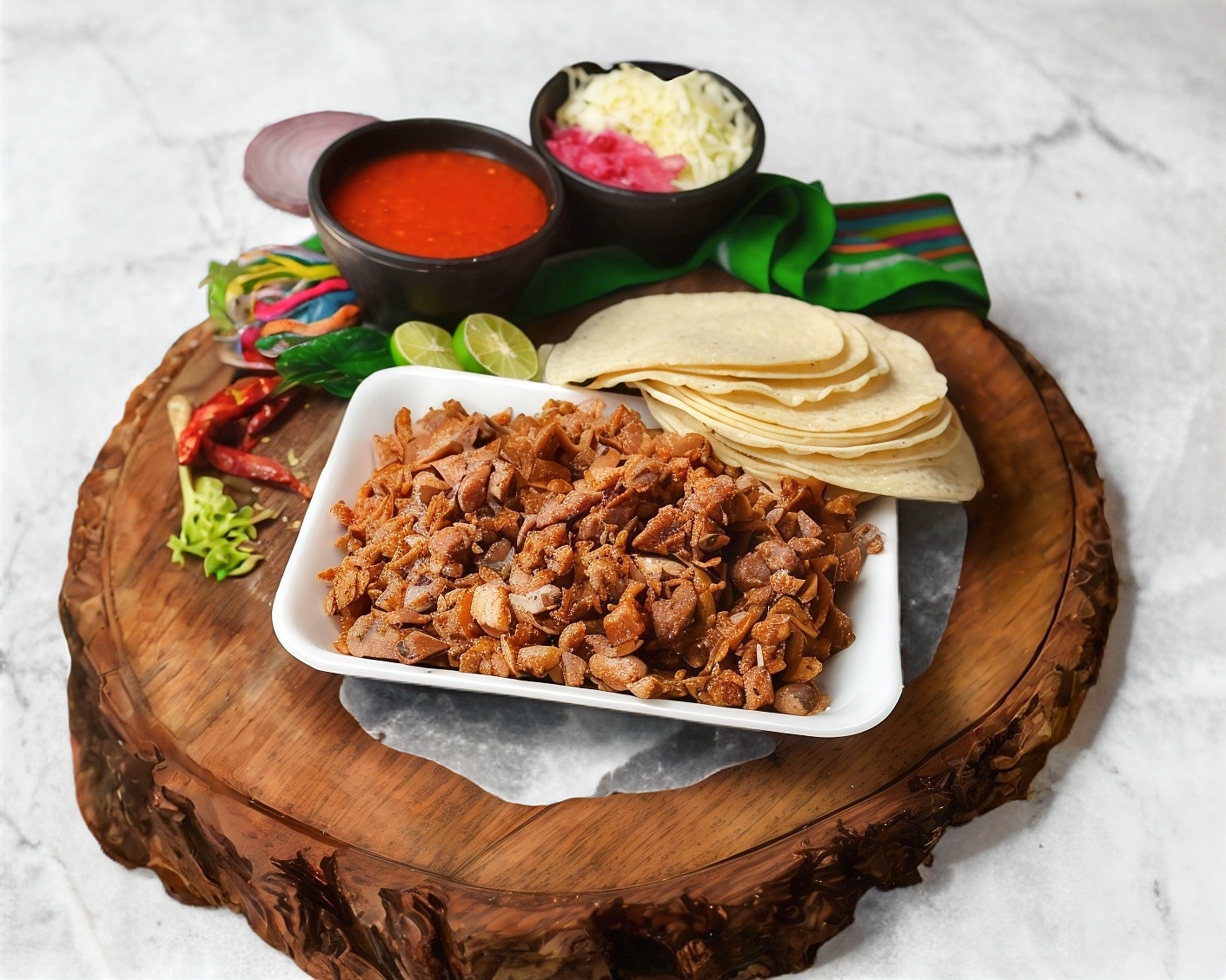 Acompañado de tortillas de maíz, salsa verde y roja, repollo, cebolla morada curtida y limones.