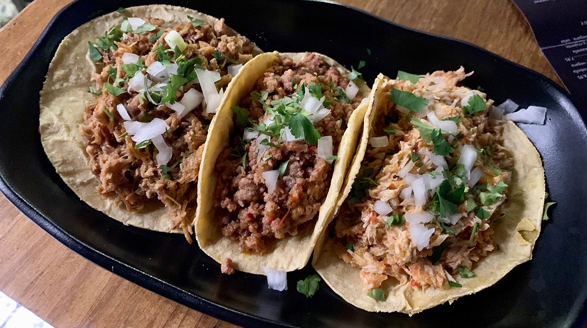 A elegir. Incluyen repollo, salsa roja con rabanitos y cilantro, cebolla morada curtida con limón, guacamole, tortillas.