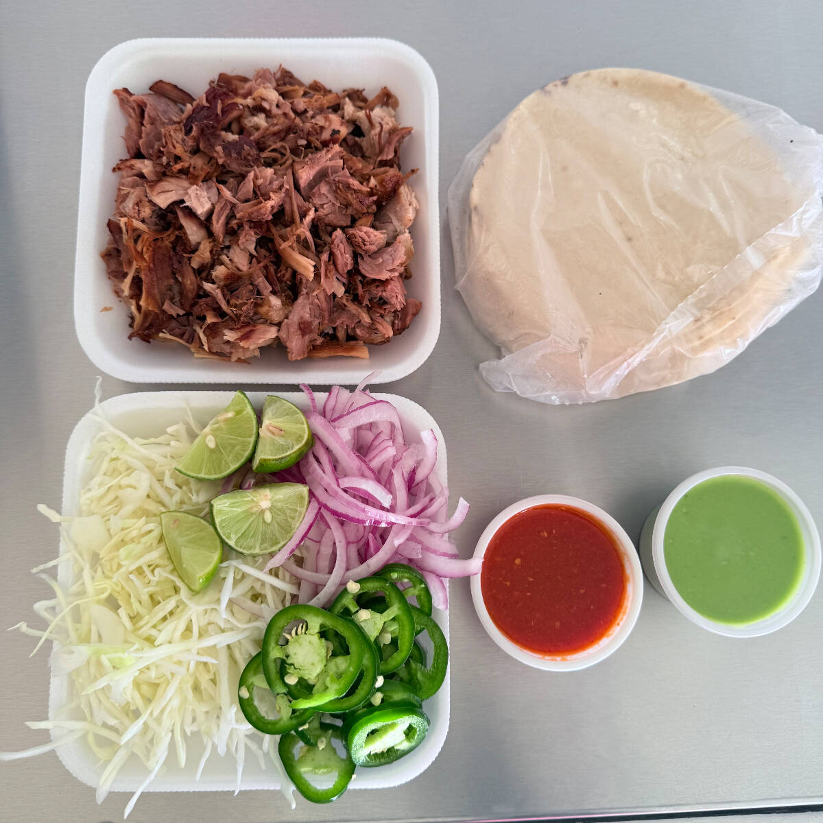 250gr de carne de cerdo, tortillas, repollo, cebolla morada, rajas de jalapeño, limón y dos salsas de tu elección.