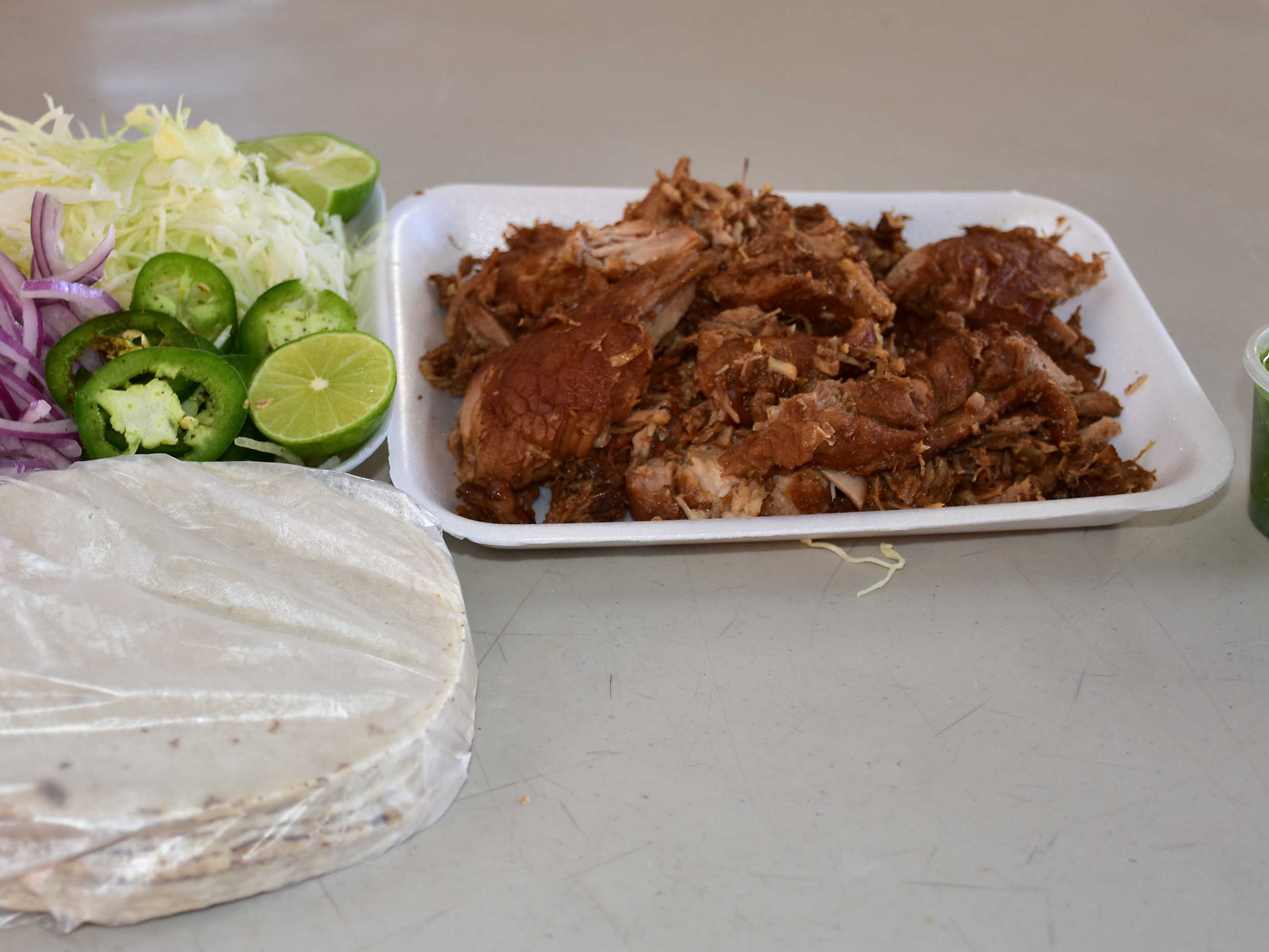 3/4 kilo carne de carnitas, incluye tortillas, repollo, cebolla morada, rajitas de jalapeño y limones.