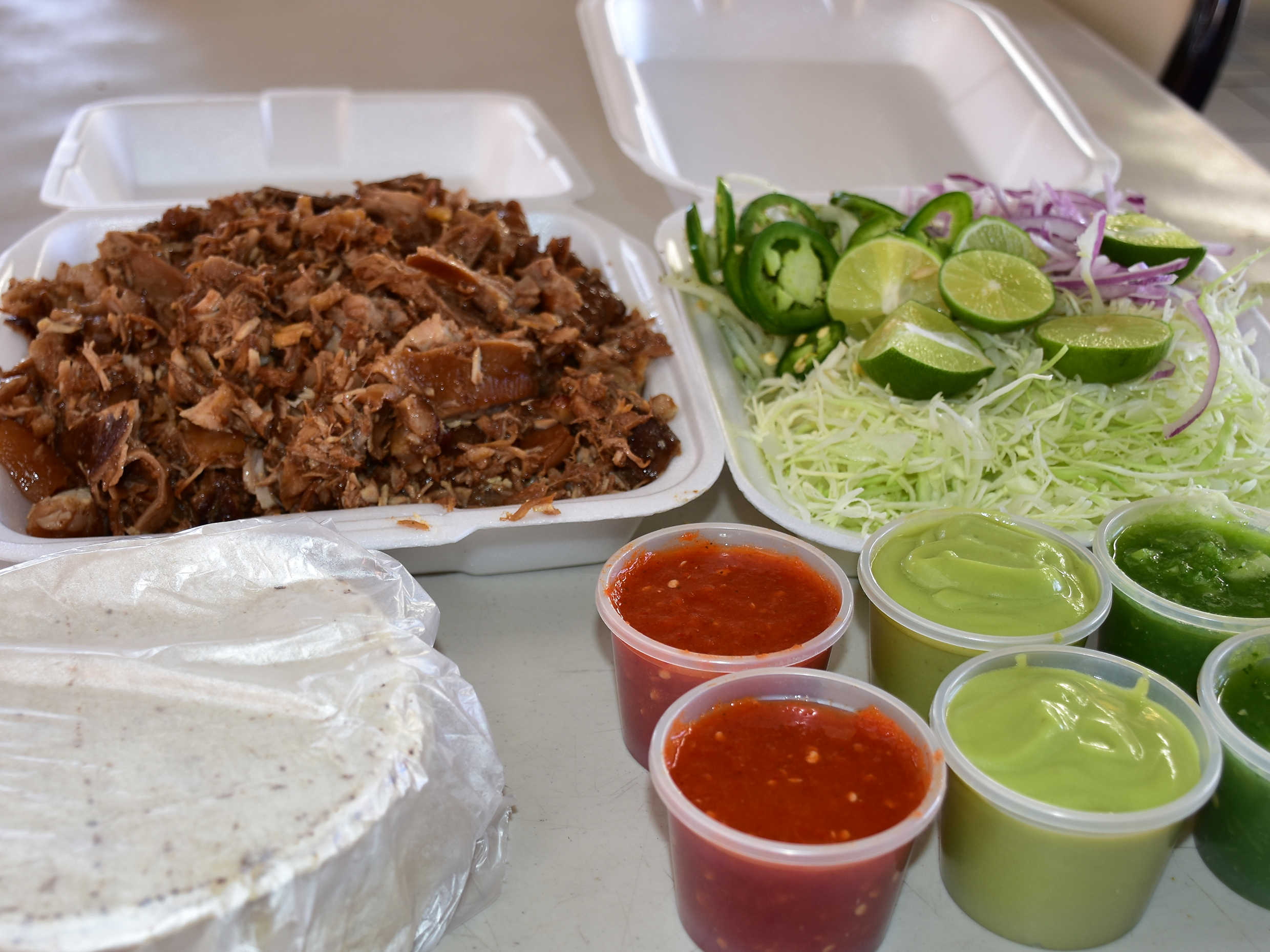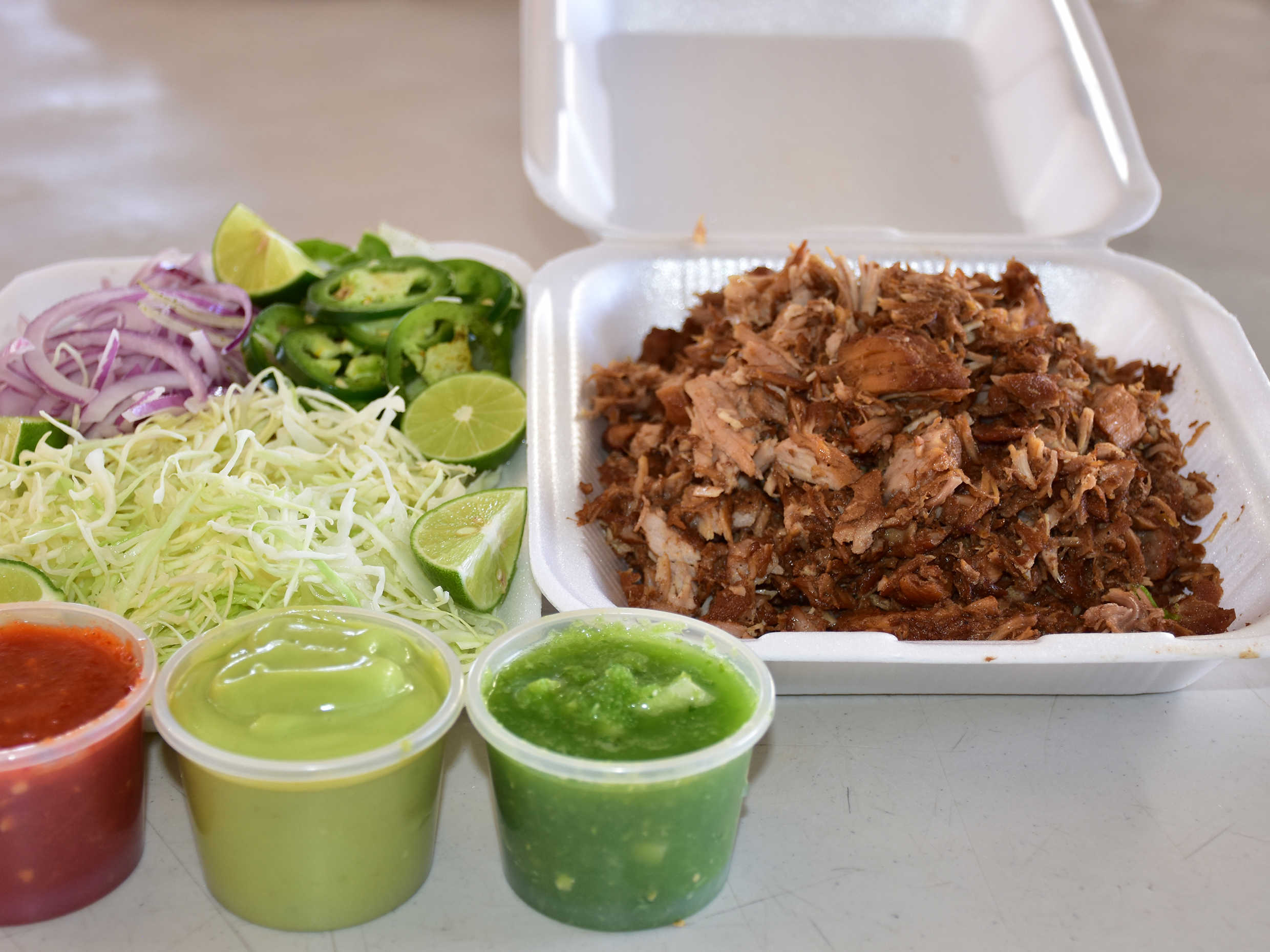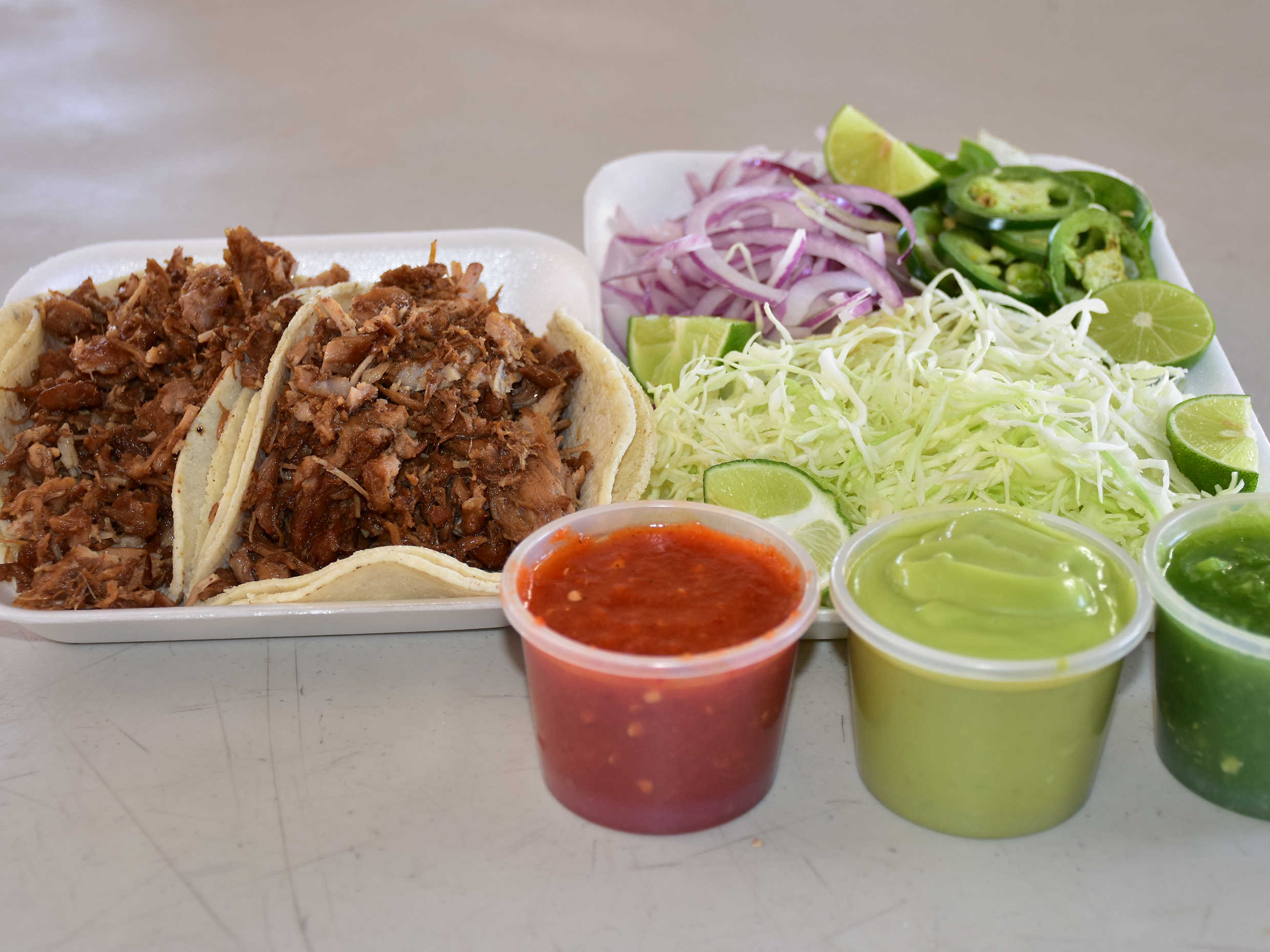 Incluye tortillas repollo cebolla morada rajas de jalapeño limón y dos vasos e salsa a elegir.