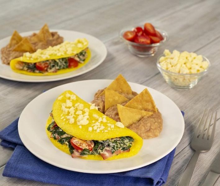 Omelette con dos ingredientes a elegir: jamón, queso, champiñones, rajas de chile verde, espinaca, pimiento, cebolla o chorizo. Acompañado de tortillas y frijolitos.