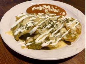 120 gr. 3 piezas. Tortilla de maíz rellenas de pechuga de pollo, bañada en salsa verde de la casa, gratinada con queso, con un toque de crema, acompañada de frijolitos.