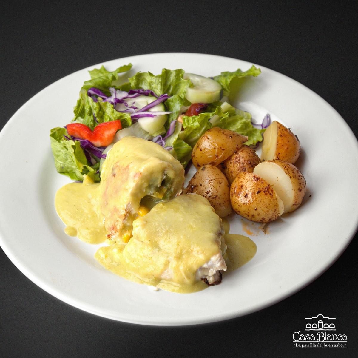 Pechuga de pollo rellena de rajas con queso, bañada en crema de chile verde, acompañada de papas cambray y ensalada